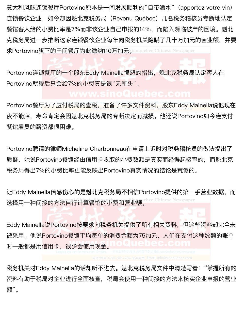 Portovino的律师Micheline Charbonneau说她搞不懂税务机关的逻辑,不明白他们为什么要了资料却不用,然后又通过一种跟企业提供的资料毫无关联的间接方法来计算。 Micheline Charbonneau律师还强调,间接计算法通常是在被核查者的会计工作做得不好,缺少很多原始单据的时候采用。她认为魁北克税务局在核查各种资料齐备的Portovino时使用间接计算法是毫无根据的专断做法,而税务局这么做的目的只有一个,那就是不惜一切代价地让人相信这家餐馆的营业额远不止它自己申报的那么多。 魁北克税务局发言人以不能妨碍司法程序为由,拒绝对本案发表评论。 |