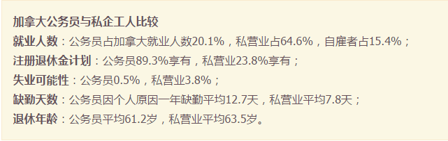 加国的公务员真是爽歪歪!首先,多发薪水的故事比比皆是。公务员们在发薪日收到了各种惊喜:有些人直接收到了两份薪水,有些退休人员居然也收到了薪水支票,还有人在离职之后仍获得报酬,甚至有人收到了双倍的遣散费。作为私营企业的雇员,你有遇到这样的好事儿吗?哪怕是一次。最近,有关加国公务员的薪水、福利的数据又出炉了,民众更是炸锅了。 薪水高得离谱 智囊机构菲莎研究所(Fraser Institute)通过搜集加拿大统计局(Statistics Canada)2015年1至12月份全年的数据,试图衡量公务员与私企雇员的薪水差距。据该研究所的最新报告显示,加国公务员的薪酬高过私企同一职级的雇员近11%。即使扣除公务员工会会费,公务员人工也多出7.2%。 我也在勤奋地工作啊,还是差这么大一截,宝宝心里能不苦吗? 菲莎研究所对照过性别,年龄,婚姻状况,教育程度,任职年期,部门机构规模,工种类别,行业职位等次之后,发现加拿大各级政府(联邦、省府和市政府)及公营机构雇员的平均薪酬,较私营企业足足多了10.6%。 更高的数据在安省,公务员平均多赚13.9%。如果不考虑教育、经验和工作职位等因素,安省各级(包括联邦、省和市级)公务员的平均薪水,要比私企高出多达41%。钱多活少,真令人羡慕! 难怪公务员那么不受待见,经济这么不景气,政府赤字连连,公务员的巨额开支还要纳税人买单,你让老百姓怎么能淡定? 并且,研究结果还指出,曾经公务员薪水低于私企的现象不复存在啦。 研究所还调查了18个不同行业的工作,发现几乎所有工种的公务员,薪水都高过私企,其中“保护类服务”,如警察、狱警、保安等公务员的薪水比私企高出40%。 福利更丰厚 更值得注意的是,不止薪水高得离谱,公务员还享有更多、更好的福利,包括医疗、牙医、退休金、工作保障等。总而言之,待遇相当丰厚。 在众多福利中,退休金是成本最高的。89.3%的公务员享有注册退休金计划,然而,私企雇员享有这类计划的只有23.8%。根据已有的数据,安省76.5%的公务员享有注册退休金计划,相比之下,私企的工人只有26%。要知道,加拿大有大约360万名公务员或公营机构雇员,只占总体工作人口的大约20%,受雇于私企的员工人数则是多达1,160万。 刚好应了那句没有对比就没有伤害。 在退休金计划中有一类是固定给付制。大部分享有注册退休金计划的公务员(93.7%)都获得了较高保障的"固定给付制"(Defined Benefit,简称DB)退休计划,他们的退休生活是无忧无虑的,因为在退休后能获得多少退休金是有保障的。不过,享有"固定给付制DB"退休计划的私企雇员,只有45%享有该计划。 人们普遍还看重的一项福利是工作保障。相比私企雇员,公务员能获得更为安稳的职位保障。2015年公务员被裁掉的机率只有0.5%,当年私企雇员被裁的机率为3.8%,整整7倍啊!在安省,私营业工人的失业率为3.9%,比公务员的0.7%高出6倍多。 再来看看缺勤天数的对比,2015年,公务员平均告假12.7天,私人企业员工以个人理由请假只有7.8天。公务员以个人理由告假的平均天数,整整超出私企雇员60%。 在加拿大独立商业联会之前公布的一份报告中,还指出政府让公务员可将其有薪病假"储存",这使政府花费高达数千万元,甚至亿元计。 此外,公务员的退休年龄也比私企雇员更早,公务员较私企雇员大约可以提早退休2.3年。在安省,公务员的平均退休年龄早1.3年。 收窄薪酬差距确保公平 研究所的报告强调,这些高数据对纳税人不公平,在经济动荡期间更加会对政府构成重大压力。针对安省公务员福利的报告是这样写的:安省政府一直陷入严重的赤字,最新季度报告显示,赤字额高达148亿元。 BC劳工联会主席 Irene Lanzinger 认为必须采取措施消除上述分歧。她还表示,私人机构雇员的薪酬应该较高。 不久前,联邦公布了10亿加元财政赤字。同时全国各省政府与市镇政府又希望控制开支。菲莎研究所财务政策中心主任蓝满恩(Charles Lammam)认为应该把公务员薪酬福利与私企雇员薪酬福利看齐,尽早改善薪水福利差异。在他看来,缩小两者的薪酬福利差距,既不会影响政府服务,也可以削减政府开支,对纳税人更加公平。 当然,我们乐于见到削减公务员的人数和福利。