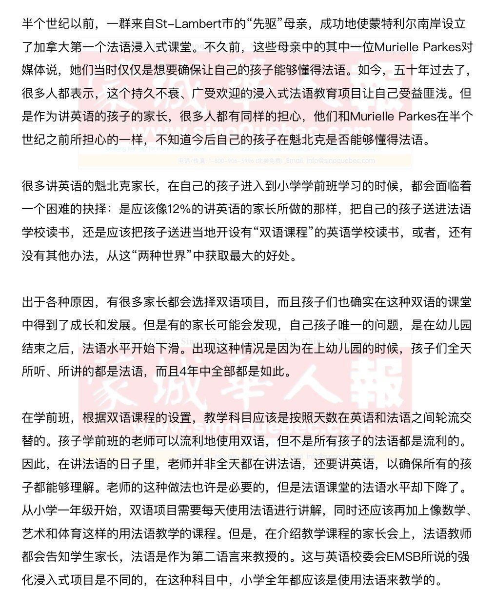 本文作者为MONTREAL GAZETTE的报纸编辑ALLISON HANES,和很多魁北克说英语的家长一样,她起先认为在魁北克英语学校上学的孩子,既能学习英语,也能通过浸入式的法语教育,掌握法语。然而事实却让她发现,不少英语学校的法语教育薄弱,指望一个双语项目可以真正地实现双语目标是不现实的。 其他的令人揪心的事情还有,在学生第一次的成绩单上,法语能力甚至不被作为评估项目,更有甚者,一些教授法语的代课老师根本就不会讲法语。面对这种情况,孩子们可能会觉得好笑,但是,在家长们看来,这是令人无法接受的。很显然,指望一个双语项目可以真正地实现双语目标是不现实的。但是,浸入式法语项目的学生家长同样也提出了批评意见,因为法语教学的强度和质量也存在着差异。 到了这个时候,不征询孩子的意见,就将他们直接转到法语学校读书已经太晚了。这个时候的关键问题是,家长们应该怎样做,才能够让孩子在英语和法语这两种世界中获益最大,这也正是魁北克一些地位独特的英语学校所能提供的东西。 也许,英语校委会一开始就需要在语言能力上对学生进行筛选,把他们分成不同的班级,来适应水平高的和水平低的学生的需要,同时还应该做出更多的努力,来鼓励学生们讲法语。这件事说起来可能要比制定语言规定,强制让学生们在进入课堂的时候、在课间休息或在课堂上的对话中使用法语更容易一些,但是,如果放任学生们使用英语,就会错过机会。 让法语学校和英语学校像双胞胎一样联合起来,或者是共享课后项目,可能是让讲英语的孩子接触更多法语口语的一个很好的办法。魁北克的英语学校委员会应该面对人口特征的变化而做出选择,勇于找出各种方法,来确保讲英语的孩子们能够熟练掌握法语。 当然,学生家长也应该担负起责任。那些希望自己的子女能够讲双语的家长,必须要尽早地让孩子进入到法语的环境之中,将他们送到法语幼儿园,参加各种法语活动和夏令营、冬令营,培养孩子在幼儿园中与讲法语的小朋友之间的友谊,甚至还要在家中讲法语等等。 作为家长,应该在五十年前的法语浸入式教育先锋的鼓舞下,为魁北克英语儿童的法语语言教育开拓出一个新的疆界,不管是在孩子的学校生活还是家庭生活中,都应该让双语成为他们的首要问题。 |