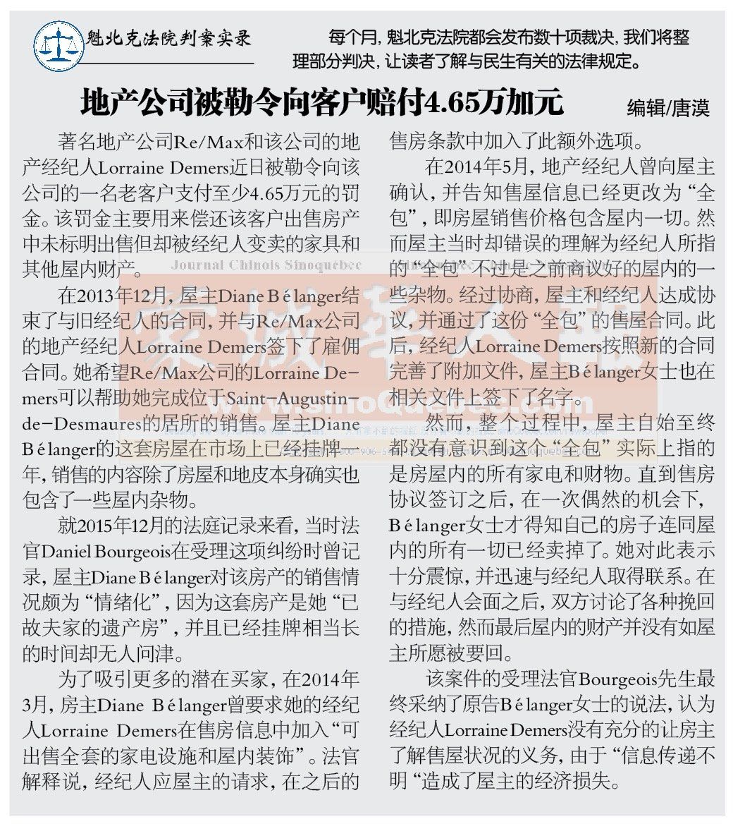 著名地产公司Re/Max和该公司的地产经纪人Lorraine Demers近日被勒令向该公司的一名老客户支付至少4.65万元的罚金。该罚金主要用来偿还该客户出售房产中未标明出售但却被经纪人变卖的家具和其他屋内财产。 |