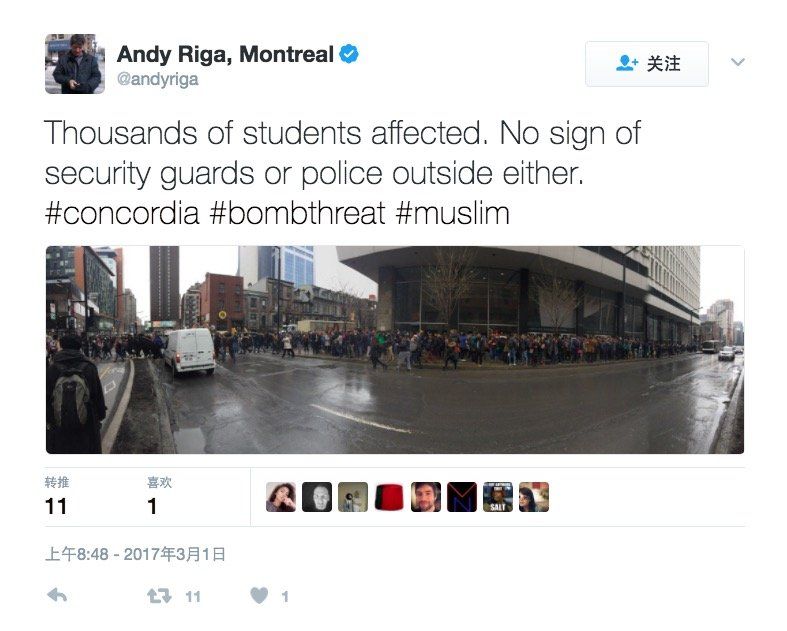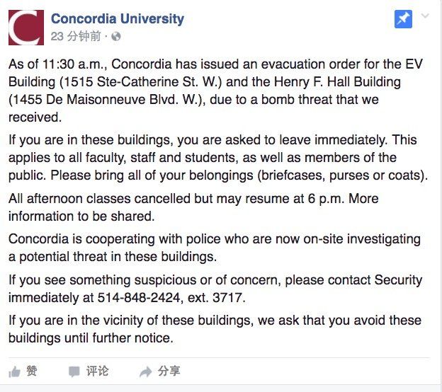 蒙特利尔Concordia大学在今天11点多收到炸弹威胁,市中心的两个大楼——EV Building (1515 Ste-Catherine St. W.) and the Henry F. Hall Building (1455 De Maisonneuve Blvd. W.), )内的教职员工全部要求撤离,下午的课程全部取消。 警方正在调查中。 有消息称,炸弹威胁与反穆斯林有关。本周一至周四,该校在其中一个楼举行伊斯兰宣传周(Islamic Awareness Week)活动。一个叫作Council of Conservative Citizens of Canada的组织向Concordia大学发出威胁信,并将矛头对准该校的穆斯林学生,他们在信中说 “Now that President Trump is in office south of the border, things have changed,”. 详情: 康大位于蒙特利尔市中心校区的三栋建筑受到针对穆斯林学生的炸弹威胁而被疏散。 今天早上蒙特利尔多家媒体收到一封炸弹威胁的邮件,信中威胁每天引爆一个小型自制炸弹,目标是de Maisonneuve大道1455号的Hall大楼,以及Saint-Catherine街1515号的EV大楼。 电子邮件上称,炸弹不是要杀死每一个人,唯一的目标是穆斯林学生。这封信要求所有大学停止在校园内的各种宗教活动。 上午11点30分左右,康大EV大楼和Hall大楼被紧急疏散。 下午12点07分,康大校方称,他们正在疏散Guy街和De Maisonneuve大道附近的一栋与EV大楼相连的建筑。 这封邮件据称由一个名为加拿大保守公民委员会发出。 蒙特利尔警方Benoit Boisselle警官称,嫌疑人通过电子邮件称,将一些爆炸物品放在了建筑物的几个地方。 现在现场有大量的警车和警察,但是并未发现任何可疑物品。 康大表示,Guy街上的John Molson商学院的所有活动照常进行。 STM曾一度暂停了Guy-Concordia车站的地铁服务,目前已经恢复。 麦吉尔大学发布安全通知 麦吉尔大学校园广播电台CKUT在康大收到炸弹威胁后,向该校学生发布安全通知。 |