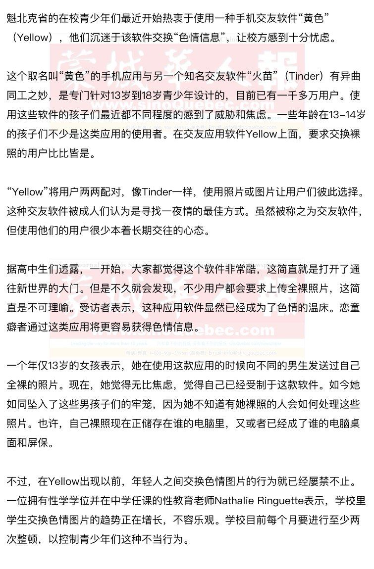 负责魁省中学生暴力行为干预讲座的Sylvain Carrier和魁省青少年保护协会(Entraide Jeunesse Québec)都认可Nathalie的看法。裸体信息交换行为在青少年群体中已经成为一种“风气”,必须要引起重视。 魁北克大学蒙特利尔分校的性学教授Laurie Fradette在2015年完成的一项科学研究显示,1%到28%的青少年曾经向别人发送过不同程度的色情信息。在加拿大儿童保护中心,被称之为“青少年自我发现”的色情短信警报的数量在四年内翻了5倍。从一年26起增长到一年122起。但是,这样的数据也仅仅只是冰山的一角。 网络援助中心的主任Cathy Tétreault指出,比较常见的情况是,在青少年小情侣们之间,女生会给自己的男朋友发送裸照。然而当他们关系破裂时,有些时候男方为了报复,往往会把女方的裸照分享到社交网络,或是直接与自己的“兄弟们”分享。 这些情况几乎总会伴有网络欺凌,René Morin解释说,当女孩子的裸照被曝光,她所得到的往往不是帮助和同情,而是网路上大家的谩骂和指责。 Cathy Tétreault强调,在网路上私自传播和分享他人的裸照属于网路性侵犯行为。对于受害者而言,隐私被侵害甚至被他人传阅所受到的伤害,和通常意义上所说的受到性侵害的伤害是一样严重的。 Valérie Brancquart在反对性侵保护性侵害受害者中心(Centre d’aide et de lutte contre les agressions sexuelles ,简称CALACS))工作,作为调理人,她十分赞同Cathy Tétreault的说法。随着科技的发展,性侵害的形式变得多样起来。除了传统意义上肢体的侵害以外,网络性侵害也悄悄发展起来。然而可悲的是,传统形式的性侵害案件也并没有因此而减少。 网络性侵害全球范围肆虐 在英国,使用Yellow应用软件传播黄色信息同样严重,已成为去年媒体关注的焦点。 在美国,密歇根一家电视台的节目披露,FBI联邦调查局的一名女探员正在协助青少年家长们抵制这款软件,软件使用者可以非常轻易地创建一个虚假的人物信息,然后以此帐号传播黄色图片。 与Yellow社交软件相关的数据 目前有1000万用户注册使用 70%的新注册用户的年龄在13到17岁 可以使用该软件上传和浏览裸照并使用虚假信息创建用户 信息提供来源:Nouvelobs.com |