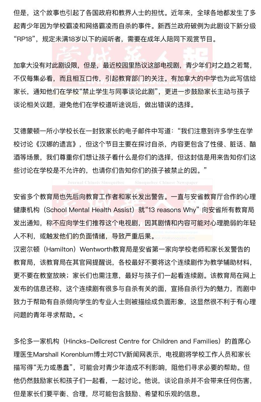 近日,在加拿大最热议的是 线上串流影音业者Netflix推出的新剧, 《汉娜的遗言(13 Reasons Why)》,这个3月底开播的新剧一出炉就成功掀起话题,因为故事内容以青少年为主,又牵涉到许多自杀、自残及忧郁症等争议性内容。 《汉娜的遗言》(13 Reasons Why)改编自美国作家Jay Asher于2007年出版的同名处女作小说,剧中深刻描述17岁的少女汉娜(Hannah Baker)在选择以安眠药结束自己生命后,将生前录好的7卷录音带,留给她的同学克莱,每一卷录音带的正反面上以1到13来编号,而每一个编号里都代表了汉娜生前的一段故事,解开她自杀之谜的线索。克莱跟着汉娜的声音,才一步步认识真正的她,也了解到原来学校里的每个人都有可能是共犯。这13个同学中,大多数是在汉娜生前对她实施过欺凌或无意间伤害过汉娜的人。有几个男生曾经不同程度的性骚扰甚至强迫汉娜和他发生关系。只有男主角克莱是汉娜唯一并不把自杀原因归结于他的同学。由于种种原因,汉娜曾经没能好好了解自己喜欢过的男生克莱,克莱在听过汉娜的录音带之后也很内疚,因为自己也曾经喜欢过汉娜并且没能阻止悲剧的发生。 这部小说在在2007年刚出版时即拿下各大奖项,更获得媒体一窝蜂的赞赏,在一片充斥着怪兽和吸血鬼的美国书市中,用清新却毛骨悚然的青少女自杀故事,夺得全球的目光,但却一直都不曾被列为限制级,甚至被归类为青少年文学,更被票选为国际阅读协会(International Literacy Association,ILA )2009年青少年最受欢迎读物(Young Adults’ Choice list)之一。 10年后, Netflix将其改编成影集,更能获得听众的共鸣,特别是在科技发达的今日,网络的影响力更胜以往,汉娜的故事也更容易发生在生活之中。 |