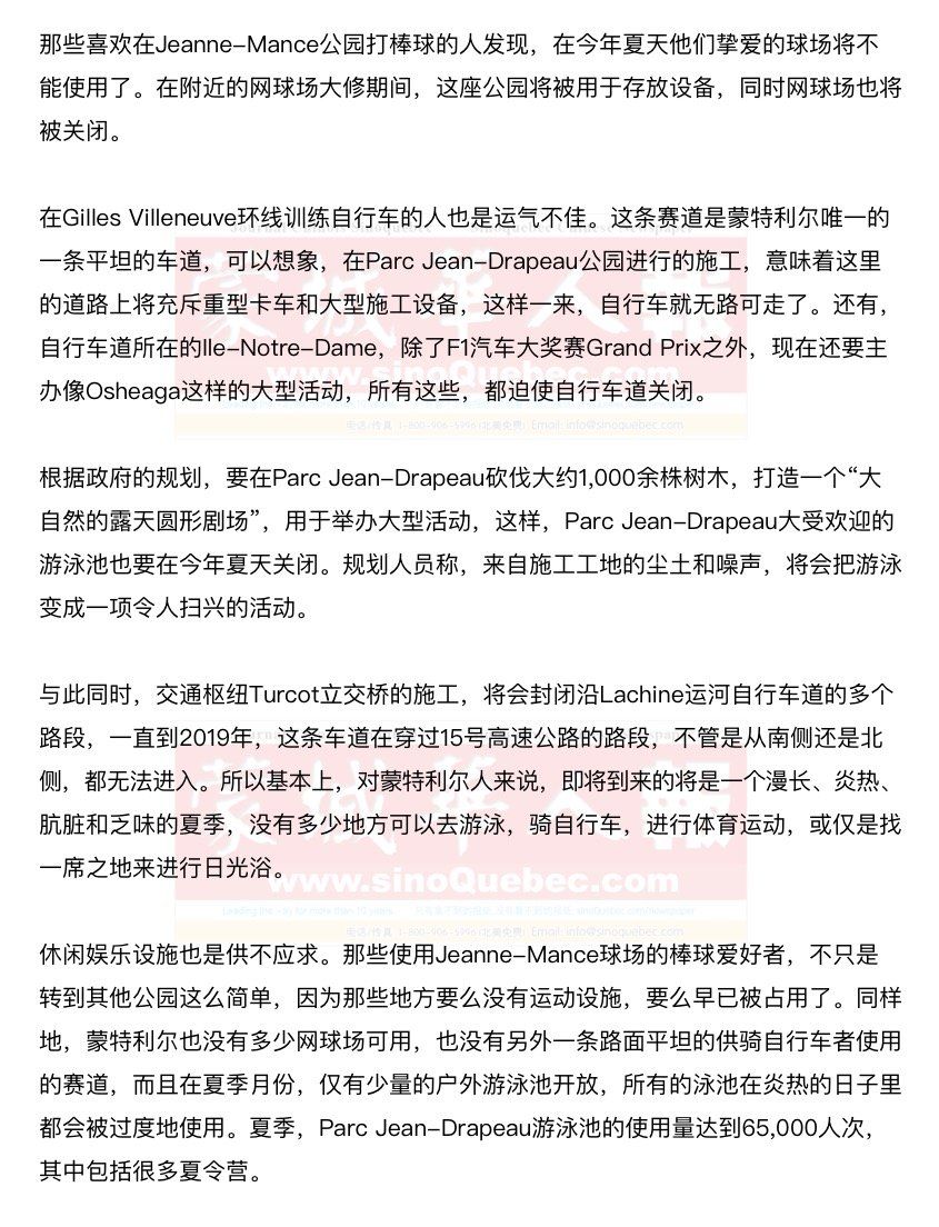 在经过寒冷而漫长的冬季之后,夏季的脚步声就可以隐隐听到了,蒙特利尔人又可以在温暖天气中进行自己最喜欢的娱乐和休闲活动了,但今年却不是这样。在蒙特利尔各公园以及休闲娱乐设施中进行的无节制的施工,正在发出威胁,让2017年的这个夏天成为一段最无趣的时光,即便是应该成为这座城市记忆闪光点的建城375周年庆祝活动也不例外,这些庆祝活动也许有很多值得纪念,但季节却是完全错误。 |