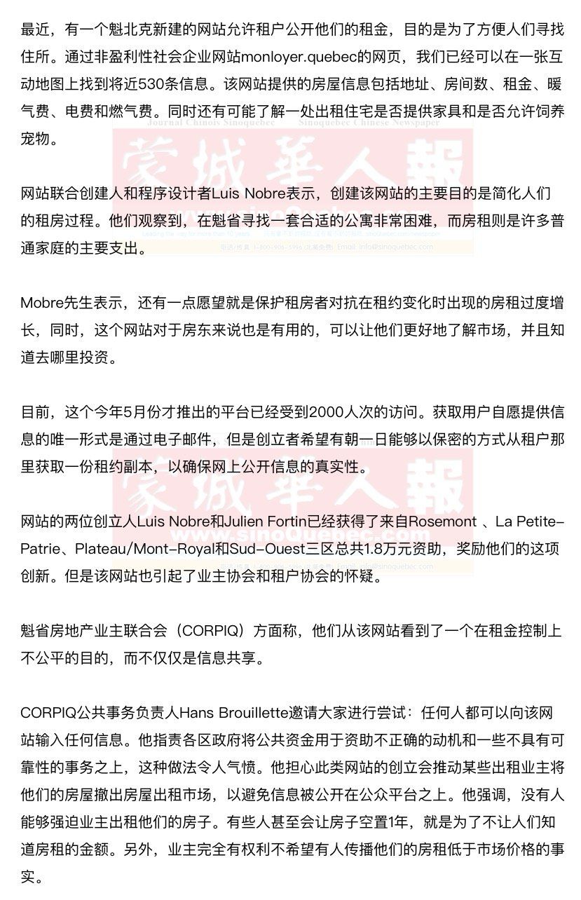 而魁北克住宅委员会和租户协会联盟(RCLALQ)则从中看到了一个“高尚、原创和有趣”的想法,但是它并不完美。 RCLALQ发言人Maxime Roy-Allard怀疑,他们的程序具有很多局限性。这些资料的价值是什么?它们在租房管理局面前是否有用?我们需要的是一份真正的、被魁省租房管理局或者魁省税务局认可的租约汇编,。 Rosemont/La Petite-Patrie区区长新闻官Francis Coté为2016年4月授予该网站的5000元资助辩解时强调,这个网站不失为一个对抗在搬家时突如其来的租金过度增长的好方法,让租客们在寻找房屋时对各地区的租金有了解,好比较。 |