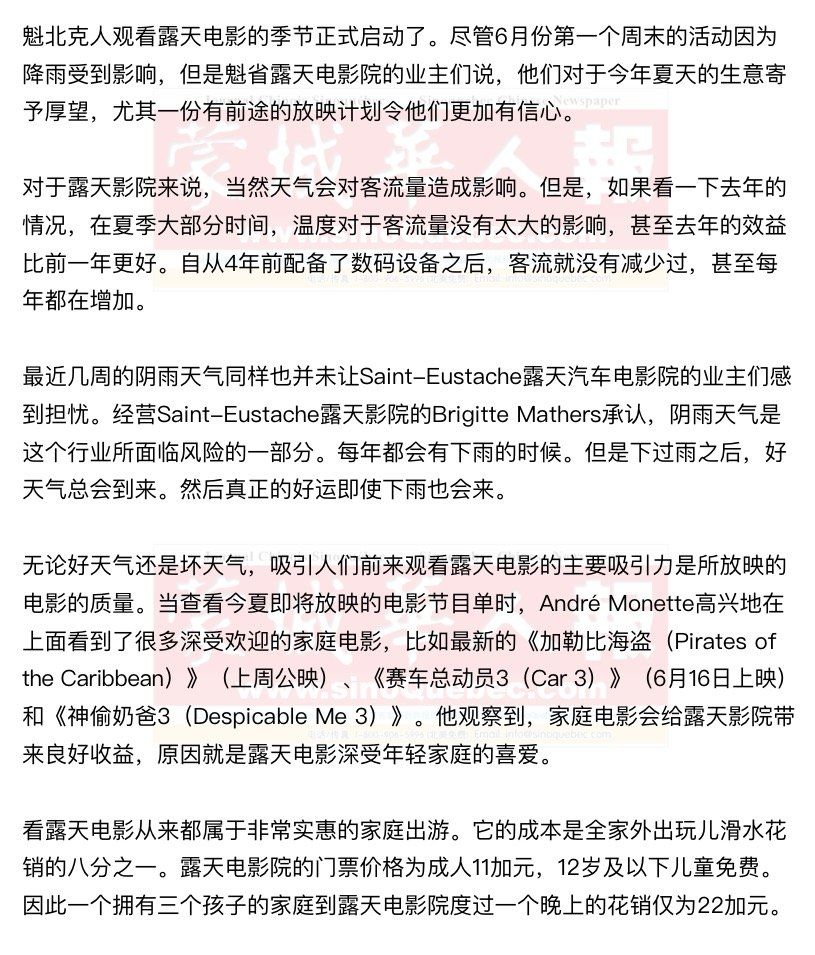 在露天电影院度过一个晚上的完美安排是,早早到达影院场地,先玩游戏直到太阳落山,然后把孩子们舒服地安顿下来让他们穿着睡衣在车里看电影。 最近10年间,露天电影院的境况已经发生了很大变化。2004年,魁省还有15家左右活跃的露天电影院。而今天,只剩下5家,其中4家位于大蒙特利尔地区。 这种状况的部分原因是,近年来,许多露天电影院业主更愿意出售土地以获取更高的利润,而不是花费数万元去购置新的数字放映设备。 魁省现存的5家露天电影院: Ciné-Parc Boucherville 地址: 1700 Rue Eiffel, Boucherville, QC J4B 7W1 Ciné-Parc Saint-Hilaire 地址: 800 Chemin du Ciné Parc, Mont-Saint-Hilaire, QC J3G 4S6 Ciné-Parc Saint-Eustache 地址: 455 Avenue Mathers, Saint-Eustache, QC J7P 4C1 Ciné-Parc Orford 地址: 2751 Rue Roméo-Lacroix, Sherbrooke, QC J1N 0H1 Ciné-Parc Templeton (Gatineau) 地址: 1779 Boulevard Maloney E, Gatineau, QC J8R 3Z1 |