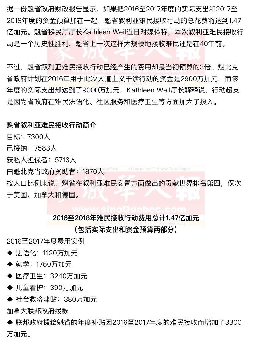 2016年由私人担保的难民人数最多的4个魁省城市 ◆ 蒙特利尔市:2337人 ◆ 拉瓦尔市:673人 ◆ 舍布鲁克市:66人 ◆ 魁北克市:35人 2016年由魁北克省政府资助的难民人数最多的4个魁省城市 ◆ 魁北克市:354人 ◆ Gatineau市:218人 ◆ 舍布鲁克市:204人 ◆ 拉瓦尔市:116人 第一批由魁北克省政府资助的叙利亚难民于2015年12月抵达魁省。依照叙利亚人权观察站(Observatoire syrien des droits)发布的数据,旷日持久的叙利亚内战造成的死亡人数已超过了32万。 Kathleen Weil厅长还说联合国难民事务高级专员公署(le haut-commissariat des Nations unies pour les réfugiés)对魁省的难民接收行动成果表示了祝贺:按人口比例来说,魁省接收的叙利亚难民数量世界排名第四。 魁省移民厅厅长办公室表示,2017至2018年度的难民接收行动预算有可能会上下调整,预算中不仅包含了魁省移民厅的开支,也包含了魁省卫生厅和教育厅等其他部门的相关费用支出。 难民的接收安置工作现已基本完成,下一步便需要帮助他们更好地融入魁省社会。语言总是难民融入的一大障碍,尽管政府和社区都提供有法语课,但法语学习却始终不是一件容易事儿。拉瓦尔社会凝聚与融合服务中心(Centre lavallois pour l’Intégration et la cohésion sociale)主任Léro Tchassao指出,很多难民在结束了法语培训之后还是不能进行功能性语言交流,法语俨然成为了他们面试找工的拦路虎。 据报道说,有些讲英语的难民已经决定离开魁北克,举家搬至安大略省生活,希望在那里找到一份工作。 |