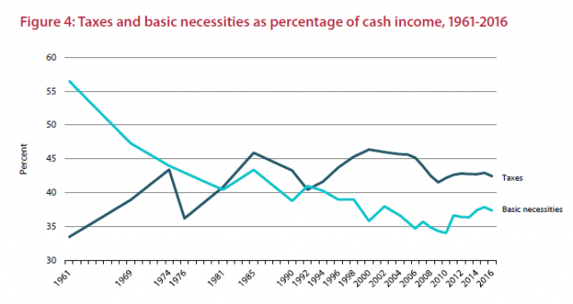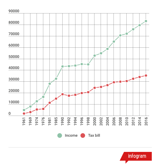 加拿大人每年缴的税款,已经远远超过家庭生活必需品开支。 菲沙学会的最新年度报告显示,加拿大人将42.5%的收入都用来缴税。 过去一年,按家庭平均收入$83,000元计算,缴的税就达$35,000元。这些税款包括联邦、省和市三级政府的税收,涉及收入税、销售税和地税等。 相比之下,普通加拿大家庭仅有35%的收入是用在基本生活必需品上。 普通家庭用于房屋(包括租房或按揭供款),食品和服装的总开支是$31,000元。 很多加拿大人可能认为,房屋是家庭的最大开支,但实事上,去年加拿大家庭的平均纳税额,超过了生活基本必需开支,包括住房。 报告指出,自1961年以来,加拿大人缴的税已经增长了超过2000%,远远超出消费产品的价格增长。用于衡量食品、住房、服装、交通、卫生医疗、教育等的消费者价格指数(CPI),在同期仅增长718%。 这就反映了一个“显著的转变”,在1961年,加拿大家庭平均用三分之一的收入纳税,近三分之二的收入用于吃穿住。 而现在正相反,我们要用将近一半的收入纳税,三分之一的收入用在生活必需开支上。 换言之,加拿大人赚的钱,交给政府的部分,比自己吃住用的还要多。 纳税与基本必需开支占收入的比率 不过,换个角度看,最新数据也显示,加拿大目前的税率并不算高,最高的是1990年代末和金融危机期间。 以2000年为例,当时加拿大人46%的收入用于纳税。2006年时,税收与收入之比仍高达45%左右,但是2012年后这一比率大幅下跌到目前的水平。 另一方面,生活基本必需开支在加拿大人收入中的比率,在1960年代大幅下跌,并持续下跌到1980年代初。 下图显示,目前加拿大人收入增长超过税收增长: |