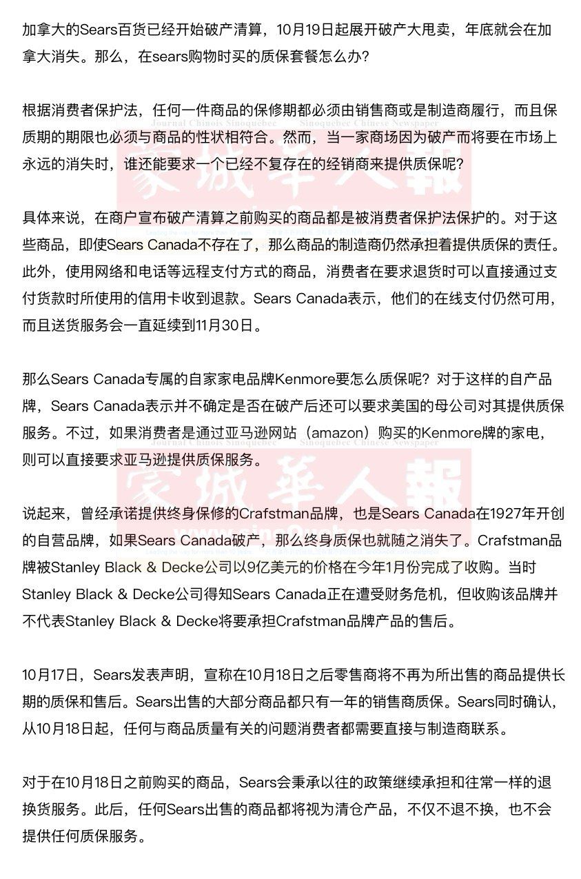 Sears坦言,公司目前正在着手寻找可靠的买家可以继续为之前出售的商品提供质保服务。但是sears不能保证未来买家一定会接受继续提供质保的购买条件。当然,前提是真的会有感兴趣的买家出价。 在破产清算期间,Sears会继续接受消费者使用俱乐部积分奖励和礼品卡。但是请消费者尽快使用。 最后,sears的旅游品牌项目都已经被Travel Brands承接,这是一家拥有消费者保护协会OPC认证的正规旅游公司。所有和sears签下的旅游合同,无论是已经执行的,还是尚未执行将要执行的,都会从魁北克旅行社消费者基金会得到补偿。Travel Brands这个品牌是在2016年才被消费者保护协会认证的。 那么,在sears破产清算期间购买完全没有售后服务的便宜货到底值不值得?那就要看您个人的判断了。 小建议 如果还有没有使用的Club Sears俱乐部积分和sears礼卡,请尽快使用。 Sears保证对在10月18日之前出售的床垫产品提供长期质保。 请保存好您在sears的消费凭证。 如果需要了解消费者保护协会对sears产品保质期的解释,请参阅网站:http://bit.ly/2igiPSm |