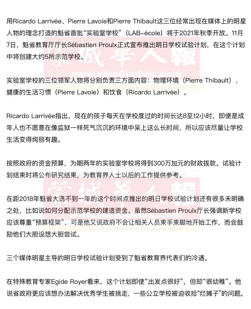 魁北克工会中心(la Centrale des syndicats du Québec)主席Louise Chabot则对政府在制定试验计划时,将教育界一线工作人员撇在一边表示遗憾和不满。 魁省教师自治联合会(la Fédération autonome de l’enseignement,简称FAE)认为这个计划是一个“公关行动”,并坚决拒绝参与。联合会主席Sylvain Mallette确信该计划是现届政府在2018年大选前的一个短期粉饰行动,不会给魁省学校的学生和教职人员带来任何好处。 |
