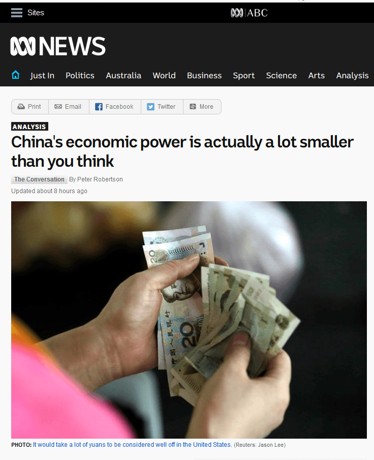 12月29日,澳大利亚教授皮特·罗伯逊在多家外国媒体上发表了评论文章称,中国经济实力比想象中小得多。