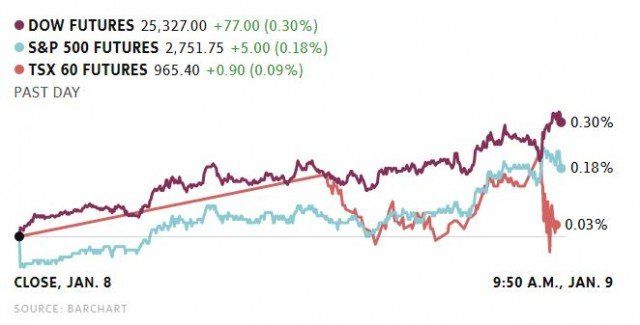 周二早盘美国股指期货走高,全球股市再攀新高。 加拿大央行(Bank of Canada)最新的商业信心指数加大了下周再次加息的预期,湾街的期货价格也有所上涨。 周一,标准普尔和纳斯达克刷新纪录。道琼斯指数由于受到健保类股票的拖累,逆势下跌。 纽约的黑石地产(Blackstone Property Partners)表示,已签署协议以每股8.10美元的价格收购温哥华的纯工业房地产投资信托(Pure Industrial REIT)。这使得交易价值达到38亿美元,其中包括债务。 加拿大抵押贷款和住房公司(Canadian Mortgage and Housing Corp.)的12月份楼市月报显示,经季节性调整后,全国所有地区的新屋开工率从11月份的251,675下降至12月的216,980。上个月的城市开工量下降了15.1%。 该机构表示,多户住宅开工量下降了22%。但是独立屋开工量上涨了4.7%。 另外,法国检察机构开始对苹果公司进行调查,因苹果公司为了避免电池老化,降低了旧版iPhone的速度。 海外方面,随着德国工业生产和出口的稳健增长,欧洲股市一路走高。 英国富时100指数早盘上涨0.33%,英国VM Morrison的股票走高。德国DAX上涨0.08%,法国CAC40上涨0.46%。 日本的日经指数周一因公众假期休市,收市是自1991年末以来的最好成绩,收于13584点,收报23,849.99点。香港恒生指数上涨0.36%,上证综合指数上涨0.16%。 商品 原油价格走高,布伦特原油触及2015年春季以来的最高水平 。到目前为止,布伦特原油的日间波动范围为每桶67.70美元,至68.29美元。 西得克萨斯中质油的价格在61.80美元至62.56美元之间。 周二晚些时候,美国石油协会将公布美国原油每周库存报告。分析师预计将出现八周下跌,预计库存下降约410万桶。 在其他大宗商品中,美元更坚挺导致金价走低。现货黄金和美国黄金期货在北美市场开盘价格下滑。白银价格也较低。伦敦铜价在美元走强后一夜之间触及两周低点,随后走势坚挺。 货币和债券 加拿大央行的商业前景调查显示,下周初升息基本无疑,加元在80美分左右。到目前为止,加元在日间交易中浮动范围是80.34美分到80.64美分,今天凌晨时分看涨。 其他货币:日本央行减持长期政府债券后,日元兑美元达到五日高点。 欧元兑美元上周接近三年来的最好水平,今日早盘走低。 与一篮子世界主要货币相比的美元指数,在黎明前几个小时中走高。 在债券方面,美国10年期国债收益率上涨至2.489%。30年期国债收益率也高于2.826%。 个股动态 多伦多道明银行(Toronto-Dominion Bank)正在收购人工智能创业公司Layer 6 AI ,具体价格不明。 Intel公司首席执行官Brian Krzanich周一在拉斯维加斯举行的CES消费电子大会上表示,为保护计算机免受芯片漏洞攻击而制定的软件补丁程序将会使机器运行速度变慢,但补丁可以防止获取数据的非法行为。 尽管英特尔想尽量淡化此次修复产生的影响,但在极少数情况下,计算机可能会减慢30%。 Target Corp.周二表示,11月份和12月份的同店销售额增长3.4%,主要得益于强劲的流量增长和在线销售,导致公司第四季度盈利预期上升。 该公司表示,预计第四季度调整后每股收益为1.30美元至1.40美元,而之前的预测为1.05美元至1.25美元。 Target 股票在盘前交易中上涨。 GoPro公司股价周二再次下跌。分析师警告称,其产品面临越来越严重的市场饱和。GoPro表示,不排斥也不主动寻求收购。 盘前交易中,GoPro股价下跌近5%,收于6.25美元,但这与周一遭受的严重下跌相比还差得远,当时该公司宣布计划退出无人机业务,裁员和降低第四季度收入预期。 在Cowen&Co将数字支付公司PayPal的股票评级升高后,其股价攀升了0.81%。 |