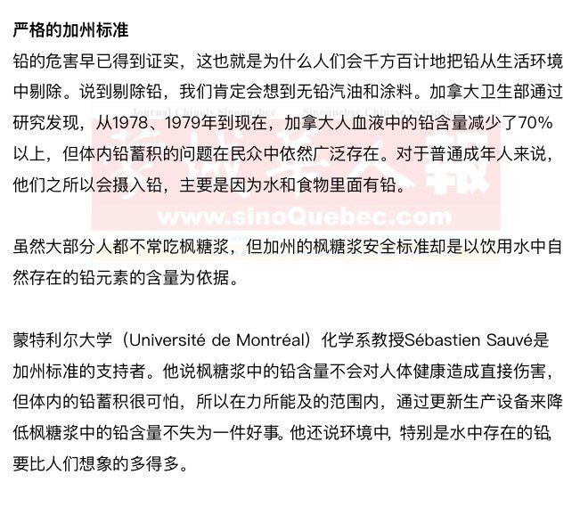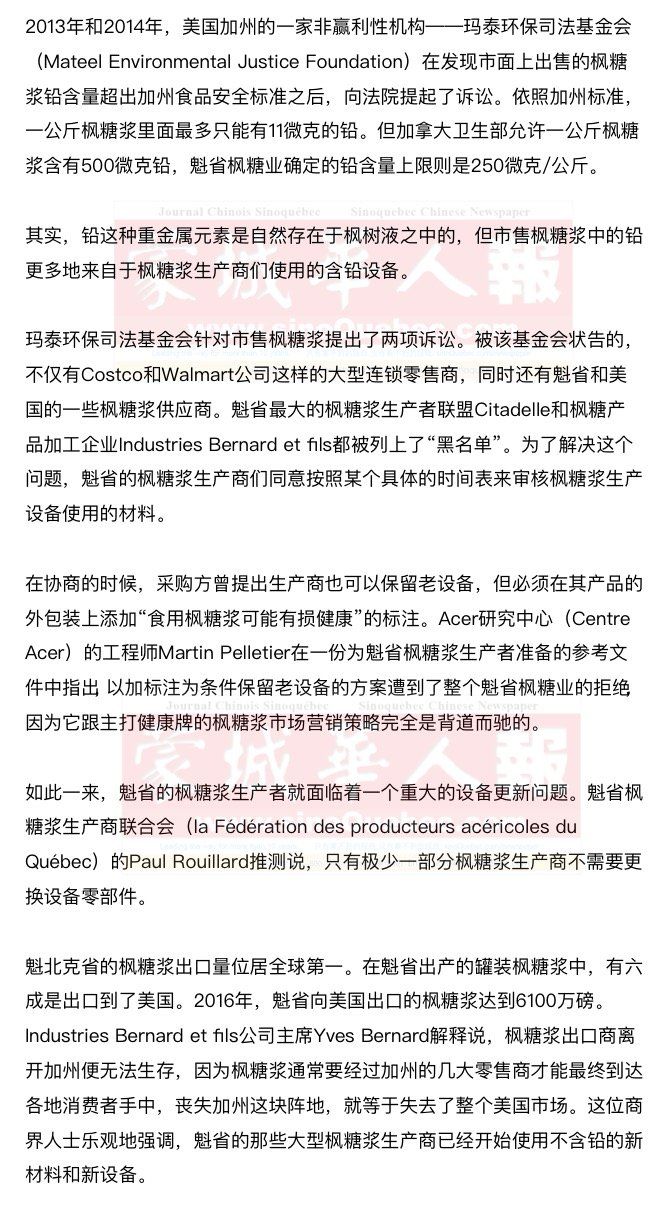 虽然魁省现在还一片天寒地冻,枫树都没开始流出液汁,但很多枫糖浆生产者却在他们的枫树林里忙碌着,因为按照有关方面负责人在美国加州签订的一项协议,魁省枫糖浆生产商以后必须使用不含铅的设备。那些枫树液引流槽口多于20000个的枫糖浆生产商必须在今年年底之前完成设备更新任务,否则就会丧失将产品出口到美国的权利。 |