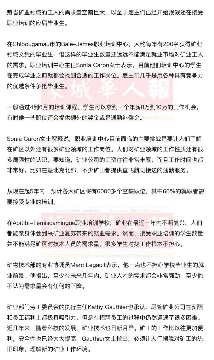 五大急需人才: 重型设备操作员(Opérateur de machinerie lourde) 坑道安全检测员(Foreur pour la sécurisation des galeries) 重型设备机械师(Mécanicien de machinerie lourde) 长钻孔技师(Foreur long trou) 维护服务人员(Concierge-maintenance) 信息来源:魁北克省矿业劳动力需求预测 超强就业需求 到2021年将有6648个职位空缺 需要职业培训的比例: 66 % Cégep培训比例 : 13 % 大学培训比例 : 7 % 其他职业学校培训比例: 14 % |