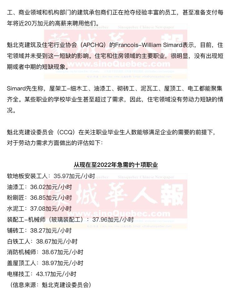 建筑公司Constructions FGP总裁Francois Godmer赞同道,他作为分包商,经常接到总承包商的电话问询,询问他是否知道哪里有能够管理一个项目的总监类人才。他们提供13万到18万之间的年薪聘用。作为Montérégie地区Saint-Basile-le-Grand一家重要的为大型项目建造木质框架的中小型企业的负责人,经常有人请求他寻找管理数百万元项目的经验丰富的管理人员。他解释道,他所认识的超过90%的现场管理人员从未进过专门的学校。他们只上过阅读图纸的课程。但他们是在工作中学习和积累的。这是一群机敏的、善于应对的人。 魁北克道路和大型工程建设者协会(ACRGTQ)副总干事Pierre Tremblay承认,目前在这一领域出现了哄抬身价的现象,因为此类职员已经成为了越来越稀缺的人才。 魁北克总承包商行会主席Pierre Boisvert同样也感受到了这种情况的愈演愈烈。他提到,好的项目经理、评估人员和行政管理人员很难找到。市场上几乎没有。 尽管魁北克建筑协会(ACQ)在谈到熟练劳动力时将之称为“少有”而非“稀缺”,但是对于目前的情况也一样了然。协会发言人Guillaume Houle指出,这种状况的问题所在是,有的人据有完成这项工作的能力,但是确实足够的这方面的经验。 不仅仅是监工或者工头类劳动力缺乏。某些有经验的行业工人也无法找到。Constructions FGP建筑公司的Francois Godmer这样说道,他目前就在寻找屋架工-细木工。 去年,他的两名经验丰富的员工已经到70岁和超过70岁了。在他们公司内部,几个屋架工都已经60岁以上。同时他有一半员工也都超过了55岁。如今,他的这家拥有30到50名员工的中小型企业需要在人员上加强。从4月份开始,他需要再增加20名员工。因为他的合同数量已经翻倍。 |