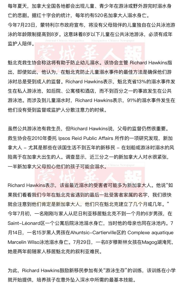 Richard Hawkins指出,大约20%的新加拿大人没有任何游泳技能,而对于那些出生加拿大的人来说这个数字还不到5%。加拿大许多小学都开展游泳课,社区也有不同级别的课程,在中学更是必修课之一。 2016年另一项主要针对11至14岁的新移民的研究揭示,与加拿大出生的同学相比,不会游泳的新移民孩子要多出五倍。结果还表明,十几岁的新移民儿童,溺水的风险高于加拿大出生的人 - 对于那些在加拿大生活不到五年的人来说更是如此。 另外,研究还表明,新加拿大人在学习如何游泳时面临许多挑战,包括文化和宗教挑战以及时间限制和日常生活的安排等。 Richard Hawkins指出:“很多新移民在其母国并没有接触过游泳池,但是当他们到达加拿大时,会立刻接触到很多游泳池以及河流和湖泊。由于种种原因,他们还没有参加游泳课程,所以估计他们有很高的 溺水风险。” 许多家长认为游泳课程可以以三四岁时开始,但实际上,专家建议孩子在出生后三个月就可以尝试进入泳池。很多社区都提供婴儿与父母同上的基本训练,从婴儿期开始锻炼他们在水中的基本技能,如屏住呼吸、安全出入水面、如何漂浮,短距离游泳等。 |