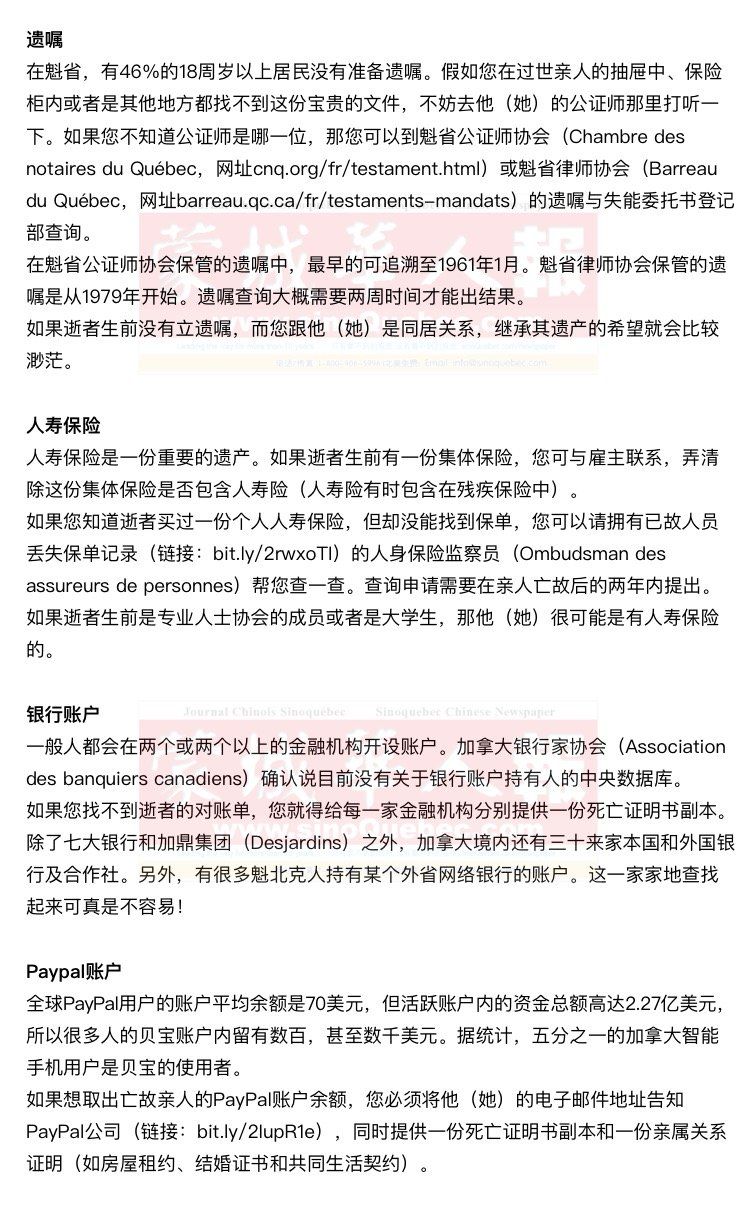 在父、母亲或者是配偶去世之后,您是否能找到他们留下的所有钱财?这个问题的答案并不是很简单。首先,您必须在魁北克公民身份管理处(Directeur de l’Etat civil,网址 etatcivil.gouv.qc.ca)为过世的亲人办理一份死亡证明书。办理死亡证明书的费用在31到62加元之间,具体金额取决于申请的传输方式和申请人要求的处理速度。 专家建议 如果您与配偶的事实婚姻关系已经存续了两年以上,那么请尽快在公证师那里立好遗嘱、失能委托书或共同生活契约。如果亡故亲人生前购买了政府的投资产品或债券,您可通过epq.gouv.qc.ca和oec.gc.ca这两个网站与政府相关机构联系。 |