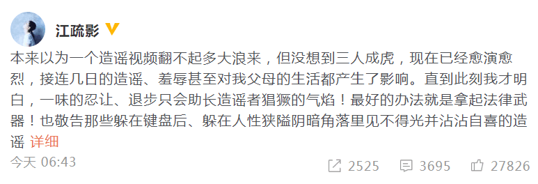 新浪娱乐讯 10月18日,江疏影微博发文怒怼造谣者:“本来以为一个造谣视频翻不起多大浪来,但没想到三人成虎,现在已经愈演愈烈,接连几日的造谣、羞辱甚至对我父母的生活都产生了影响。直到此刻我才明白,一味的忍让、退步只会助长造谣者猖獗的气焰!最好的办法就是拿起法律武器!也敬告那些躲在键盘后、躲在人性狭隘阴暗角落里见不得光并沾沾自喜的造谣者,你在做我在看,有种咱们就刚到底!!”随后,江疏影工作室转发微博称:“从发布声明至今,仍有一些造谣、传谣者罔顾真相,恶意传播虚假视频,甚至借机敛财!鉴于此事涉嫌诽谤并严重侵犯江疏影的名誉权,我们已交由专业律师团队依法处理,也敬告那些造谣、传谣者,这一次, 我们绝不姑息!” |