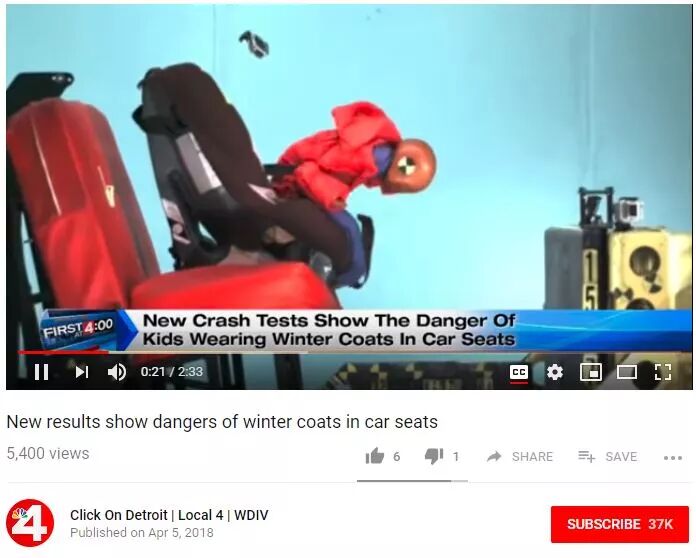 近日,加拿大脸书社交网不断在传播一条消息: ![]() 妈妈群里有家长不断提醒小孩正确的坐车方法,并且转发了一个今年4月Youtube的视频。 ![]() 在碰撞测试中,一名身穿羽绒服的小孩模型竟然飞了出去。。。 下面看看整段视频: 其实每年踏入冬季,加拿大和美国各大安全机都会不断提醒家长,切勿让小孩穿着蓬松的大衣坐汽车座椅。 ![]() 因为如果发生碰撞,小孩会从汽车座椅飞出去....后果不堪设想 ![]() ![]() 环球邮报近日发出提醒,称小孩穿着蓬松衣服坐汽车座椅会有危险 ![]() 美国《消费者报告》(Consumer Reports)近日亦更新相关报道。 穿羽绒服车祸时会飞出去 国内湖南卫视和长沙理工大学去年曾经联合做了实验测试,证明这个观点原来是真的。 ![]() 碰撞测试中,没穿羽绒服假人宝宝只是在汽车座椅上微微回弹。 ![]() 而穿了羽绒服的假人宝宝像金蝉脱壳一样,从羽绒服里飞了出去。 ![]() 原来,孩子穿上比较厚的羽绒服,坐姿会发生变化,肩部的高度增高 当汽车发生意外,强烈的碰撞冲击,安全带只是固定羽绒服,而根本不能有效地固定孩子。 ![]() 于是,孩子就像碗里的剥壳鸡蛋,一旦遇到碰撞事故,可能会滑脱出来。 最后,小孩以重量的20倍的力量抛射出去,造成颈椎、头部的挫伤,严重甚至会造成死亡! 加拿大:不应穿冬季外套坐在汽车安全座椅 对于穿冬季大衣坐汽车的危险性,加拿大儿童乘客安全协会主席Katherine Hutka是这样解释:“安全带的设计是把孩子固定在座位上以防止受伤,但是,如果在孩子和汽车安全带之间增加了一层厚厚蓬松衣服,蓬松衣服在碰撞时会受压,令到安全带肩带突然松动,小孩就有受伤或弹射的危险。” ![]() 如果当这件事发生在儿童的外套或婴儿睡袋(bunting bag)时,如果安全带肩带已经不够紧,将无法保证小孩安全。 ![]() 魁北克省汽车保险公司(SAAQ)说,当一辆时速50公里的汽车发生碰撞事故时,汽车上人和物体会以重量乘以20的力度抛射出去。例如:一个18公斤的孩子变成了一个360公斤的抛射物。 正确做法 1、检查安全带是否过松 所以,冬季外出,乘车前一定要检查小孩的衣服的面料是否光滑,填充物是否蓬松,到底怎么检测呢? 美国《消费者报告》11月15日的报告里,介绍一个简单的方法来检查小孩的外套是否太大,过于蓬松而不能穿着坐汽车。 ![]() 步骤1:让小孩穿上外套,坐在汽车座椅上,系好安全带。 拧紧安全座椅背带(Harness),直到缝隙小于拇指和食指两个手指的宽度。 ![]() 步骤2:保持汽车座椅的背带标准不变,把小孩脱掉外套再坐回汽车座椅,然后再扣好。 ![]() 如果这个时候,你可以轻松用拇指和食指捏住汽车座椅的边带,那么,这件外套太笨重,不能穿着坐安全座椅。 二、婴儿反向坐 如果是婴儿,记住,汽车座椅一定要反向,让婴儿背对车头方向。 ![]() 这样,如果发生碰撞,小孩不会飞出去 ![]() 根据加拿大安省交通法规定,要求体重小于20磅的婴儿使用背对汽车座椅,并且称最好一直都这样坐,直到小孩超出汽车座椅建议的最大重量和高度,例如有些背向座椅的最大重量是45磅(20公斤) 三、注意保暖 小孩坐car seat尽量少穿衣服,但注意保暖 ![]() 如果是婴儿,可以盖一张毯子在孩子身上。 ![]() 对于较大的小孩来说,将外套脱下反转穿,这样外套就像毯子一样放在汽车座椅的安全带上。 事关安全,大家一定要重视! |