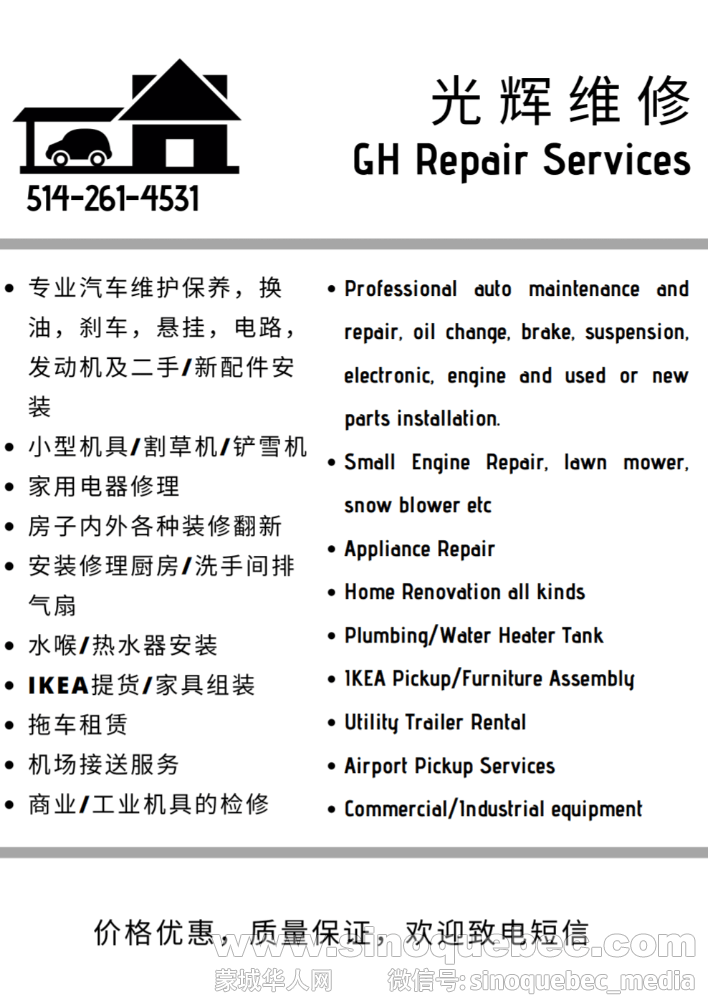 房子有关里里外外装修,维护,修补 。 持牌认证技师汽车的维护维修,保养,刹车,悬挂,电子电路等等。 家里的各种电器,冰箱/炉头/洗衣机干衣机/的维修保养 机具的维修。割草机,铲雪机 等等。 请电:514-261- ...