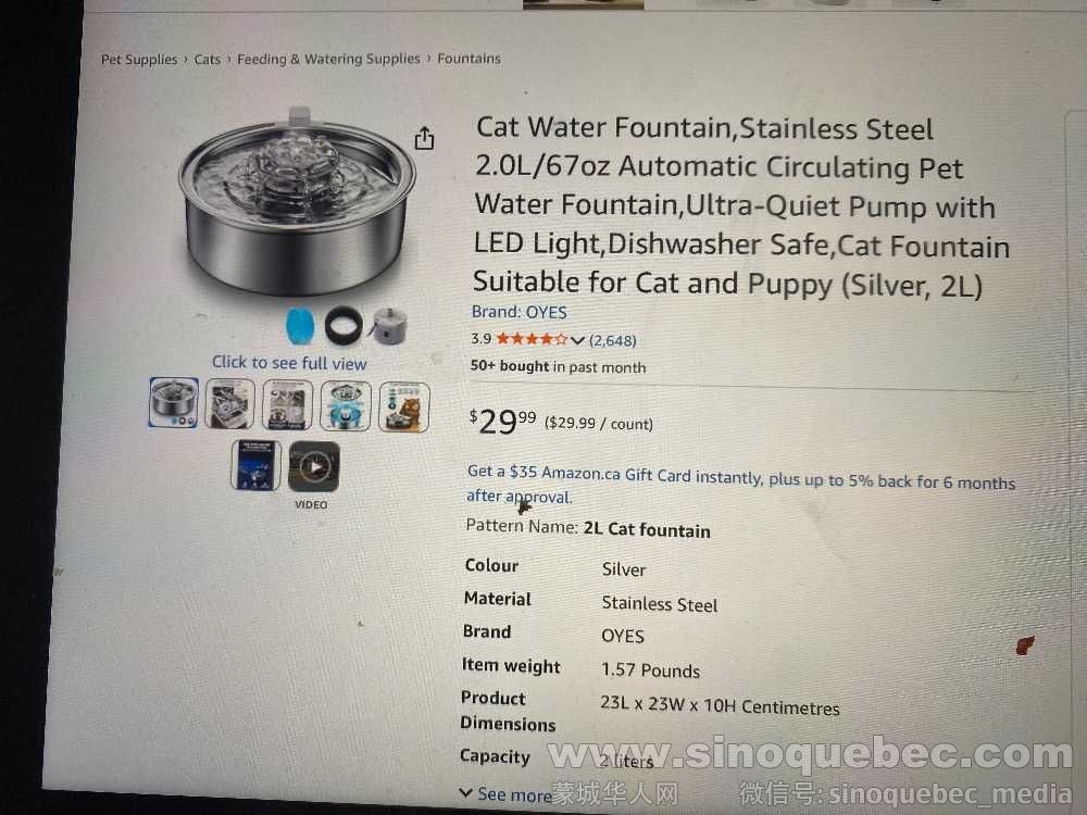 转让一个宠物饮水机,不锈钢,9成新,带原包装和说明书,原价34.49 元(含税),现在低价转让 (20元),并赠送两套没有用过的filter 加foam , 如图:易清洗,好打理。 欢迎电邮:cathyguo1997@yahoo.ca 谢谢! ...