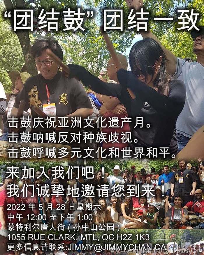 慶祝亞洲文化遺產月-擊鼓活動 邀請您的到來!蒙特利爾唐人街今年第一次多元文化擊鼓活動。鼓聲團結! 本次唐人街文化擊鼓活動由蒙特利爾華商會、加中文化藝術交流促進會、陳穎川堂、同一世界同一人類(人道主義使命 ......
