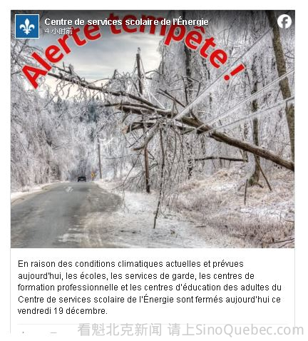 由于道路状况恶劣,今天魁北克省多个学校服务中心(CSS)决定关闭旗下学校和相关机构。其中包括位于 Mauricie 的 Centre de services scolaire de l’Énergie。该学校服务中心在其 Facebook 页面上写道:“鉴于当前 ......