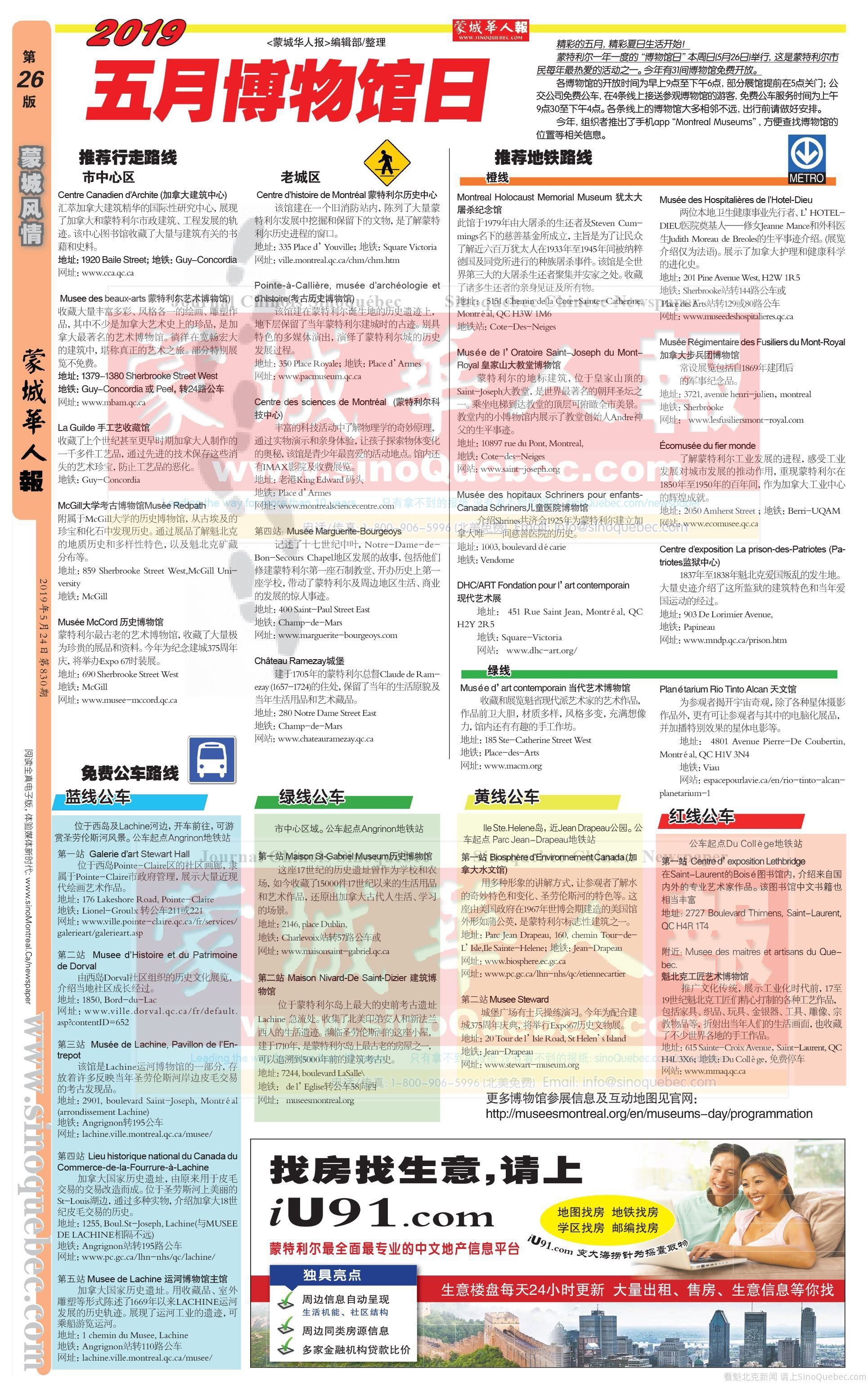 蒙特利尔一年一度的“博物馆日”本周日(5月26日)举行,这是蒙特利尔市民每年最热爱的活动之一。今年有31间博物馆免费开放(见下表)。 各博物馆的开放时间为早上9点至下午6点,部分展馆提前在5点关门;公交公司免费公车,在4条线上接送参观博物馆的游客,免费公车服务时间为上午9点30至下午4点。各条线上的博物馆大多相邻不远,出行前请做好安排。 今年,组织者推出了手机app“Montreal Museums”,方便查找博物馆的位置等相关信息。 5月26日当天,租借BIXI自行车游览相近的博物馆也是一个非常环保的出行方式,当天BIXI推出免费租赁活动。 点击下图见清晰文本