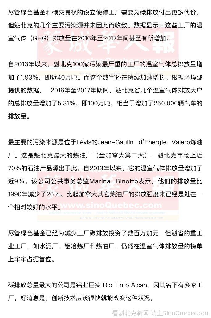 榜单的前100名中还有一些令人吃惊的名字。例如Gatineau的Cook卫生填埋场,虽然早已于28年前关闭,但每年依然继续排放超过25,000吨由有机物发酵产生的二氧化碳。 麦吉尔大学位于市中心的校区也是一个严重的污染源。由于采暖系统的老旧,该校区每年共排放超过30,000吨的二氧化碳。校方承诺在2040年拆除所有燃气锅炉,改为电力供暖,从而实现零碳排放。 魁省省长 Francois Legault刚一上台就不得不面对这个事实:魁北克省2020年的温室气体减排目标 -- 比1990年减少20% -- 将无法实现。预计只能减少9.1%。省长指责前任政府使道路行驶车辆急剧增加。但排放温室气体的罪魁祸首并不仅是车辆,如前文所说,工业生产占据的比重非常大。 麦吉尔大学生物学教授、加拿大气候变化和热带森林研究主席 Catherine Potvin 说,在减少温室气体排放的问题上,所有人都有责任。政府、工厂和市民都应该为此付出努力。温室气体排放超标证明我们做得还不够好。如果社会各界都能遵从低碳生活生产的原则,温室气体排放量就可以被减少。 环境部不认为碳排放量的增加即意味着可耻的失败。魁北克目前通过在碳排放权交易市场上与美国加利福尼亚州的合作来减少向大气层的排放。污染型企业必须购买其它污染较少的公司出售的污染许可证。 环境部拒绝公布完整的数据,无法得知魁北克省从加利福尼亚州购买了多少污染许可证,也不知道每个污染型企业有多少免费配额。 需要注意的是,2013-2020年应对气候变化行动计划中没有针对重污染工业制定具体减排目标。绿色基金管理委员会在2018年11月出具的报告中也强调了这一重要缺陷。 |
