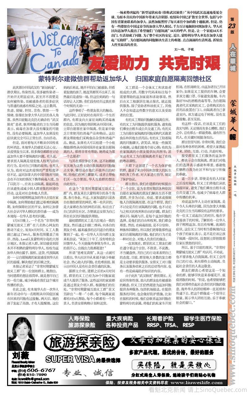 一场来势凶猛的“新型冠状病毒(俗称武汉肺炎)”从中国武汉迅速地蔓延全球,为原本喜庆的中国新年带来几许阴影。疫情从中国已扩散至全世界,包括与中国有着紧密联系的加拿大。虽然加航暂停了每天来往中加的数十趟航班,但是,仍有一些滞留在中国过春节的加拿大华人移民,千方百计地辗转回到加拿大。华人社区向返加华人提出了希望他们“自愿隔离”14天的呼声,但是,让一个家庭14天不出门,生活却成了问题。为了整个社区的安定,近日,蒙特利尔华人率先在加拿大建起“互助群”,为自愿隔离的同胞解决生活上的难题。点点滴滴的生活所遇,折射出人性里最真的善美。 此次源自中国武汉的“新冠病毒”,潜伏期长、传染性高,很多被传染者一开始并无明显症状,甚至并不清楚是如何被传染。而被感染者的很多症状与普通的流感有相似之处。过去数周,焦虑、猜疑、担忧、悲伤、愤怒……等情绪,弥漫在加拿大华人社区的各人角落。虽然目前魁北克仍无确诊的“武汉肺炎”患者,联邦和魁省的卫生当局都表示,病毒在加拿大没有爆发的可能性,没有必要隔离,返加华人如果没有症状就完全可以正常生活、自由活动。 但是,面对着每天不断从中国传来的坏消息,本地华人仍感觉无法心安。 从疫情发生以来,很多微信都群在讨论返加华人要不要隔离的问题。有人说,要求别人隔离是侵犯他人权利与自由的行为,是对自己同胞的歧视;也有人认为,政府对这次疫情的严重程度评估不足,返回加拿大的中国同胞有可能会在不自知的情况下携带病毒入境,为了以防万一,应该主动隔离,最起码也应该避免或减少到人群密集的环境中活动,这是对社会和他人负责。 如何劝慰刚刚返加的华人自觉在家中隔离,如何帮助他们渡过艰难的隔离期,如何保障社区的平安,如何让加拿大社会认可华人移民的责任感……成为本地每一位华人思考的问题。 1月31日晚上,一个名为“非常时期蒙城互助义工群”在几名热心网友的推动下成立,短短4天时间,义工人数就已超过了380人,服务范围覆盖了南岸、西岛、Laval以及蒙特利尔岛的大部分地区。本报记者入群,深切感受到原本并不相熟的蒙特利尔华人,纷纷为返加华人伸出援手,接机、送货、代找隔离房……让自愿隔离的家庭感受到华人社区的温暖,解决他们的后顾之忧。 详细报道见本周《蒙城华人报》 |