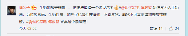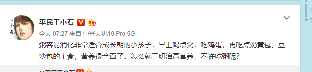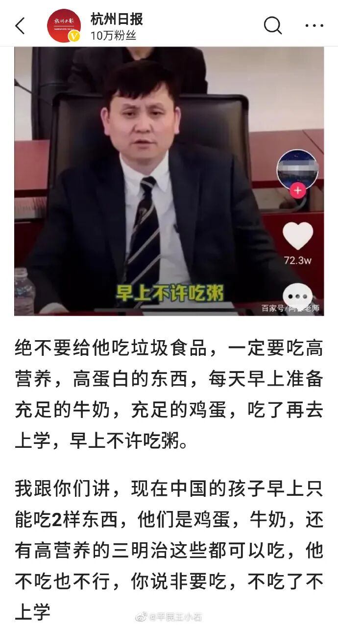 昨天,一则微博在疯传。 某著名军事大V,600多万粉丝,抓住张文宏直播时说的一句话“不许吃粥”不放,大作文章: 甚至扣上了“崇洋媚外”的帽子。 这微博至今已经有6500次转发,而且我每刷新一次,都几百几百地往上涨。 这还不止,在这条微博的转发链里,我们能看到许多熟悉的面孔。 比如司马平邦把原文中的“粥”,上升到了“中国粥”。把张文宏这次的观点,上升到了和“中国粥”较劲。 ![]() 背后想暗示什么,不言而喻。 ——你和“中国粥”较劲,你反对中国,所以你坏。 比如这位主编,觉得喝牛奶都是崇洋媚外,还给出了一套解决方案: 牛奶性寒,加热了也寒,最好加葱姜辣椒吃。 ![]() 你都不知道他到底是蠢还是坏了。 还有那位原博主,今天更是又发了好几条微博,每一条都直指张文宏崇洋媚外,为美国说话。 比如这个: ![]() 我看了视频。 且不说这是二月份的一个视频,拿到现在黑不合适。 而且视频的内容,是呼吁大家不用太为美国担心,不要觉得我们把美国的口罩都买走了美国人没办法了,我们管好我们自己就行了。 这也算崇洋媚外??? 至于这些军事博主的评论区,更是乌烟瘴气: ![]() ![]() ![]() ![]() 注意,他们口中的公知不是“公共知识分子”,而是“卖国贼”的意思 他们这个圈子,字里行间,仿佛要把张文宏生吞活剥了。 让人不寒而栗。 1,张文宏说错了吗? 最关键的是,张文宏没说错啊。 我特地去看了当时的完整的视频,视频里张文宏并不是说粥是垃圾食品,而是说不要给孩子吃垃圾食品。 这没问题吧? 然后强调这段时间是特殊时期,孩子要多补充蛋白质,多喝牛奶,多吃鸡蛋,多吃有营养的三明治。 这没问题吧? 中国大部分家庭,给孩子喝的粥,是白粥,里面没什么蛋白质,至少没有牛奶鸡蛋蛋白质多。 这也没问题吧? 怎么把三个没问题的东西放在一起讲,就被解读出“崇洋媚外”了呢? 合着粥代表中国,不让喝粥也辱华了。 合着鸡蛋是国外才有的东西,吃鸡蛋就是崇洋媚外。牛奶是外国人才喝的东西,喝牛奶就是崇洋媚外? 那我们国家7部委启动的让孩子喝牛奶计划怎么说? ![]() 让人迷惑。 而且实话实说,粥,尤其是普通家庭早上爱喝的白粥,确实营养含量太低了。 以前我们家,早饭就是前一天的剩饭,加点水煮出来的稀饭,我们叫做“烫饭”。很多时候,早上只有“烫饭”和咸菜,其他什么都没有。 这样的东西喝下肚,不到11点就饿了。 因为说到底,这里面除了碳水化合物,其他什么都没有,而且因为是精米做的粥,所以GI指数很高: ![]() 而张文宏在说现在要多补充蛋白质给孩子增强抵抗力,当然会说“早饭不要喝粥”。 事实上,虽然是直播嘴快,他还特意强调了可以吃高营养的三明治: ![]() 这怎么都比这位博主提倡的: 碳水+碳水+碳水+鸡蛋的饮食结构健康吧。 ![]() 现代营养学,是中外许多科学家,根据人体需要的营养物质发展出来的,是一门科学。 而科学是没有国界的,人类该需要什么就需要什么。 什么是对的,什么是错的,都是不根据你的国籍改变的。 比如粥里营养物质少,这就是客观事实,不是说因为粥是“中国粥”,普通人家庭的粥,就变成了高蛋白的物质了。 也别说什么,我们都是喝着白粥长大的,所以白粥没问题。那我们上一辈可能一个月才能吃一次肉,所以一个月不吃肉没问题? 那是当时没条件,也不懂营养学。 你没看中国人一代比一代人吃得好了以后,我们的孩子一代比一代长得高了吗? 我就不明白了,为啥什么都要往爱国上靠。 吃个日料就是忘记国耻,吃个披萨就是跪舔白人。 那玉米、西红柿都是源自国外的,都不能吃了? 辣椒也是产自国外的,川菜湖南菜都不做了? 方便面是日本人发明的,味精是日本人提纯的,微波炉是日本人做出来的,家里的都扔了? 真的乌烟瘴气。 2,他们不懂吗? 如果说这些博主下面的“铁粉”,是真的不懂,我相信。 但这些数百万粉丝的大V不懂这些,我是万万不信的。 他们说到底,其实就是看张医生不爽,想带张医生的节奏。 上一次他们的节奏是“张医生”的收入,说张文宏的钱太多了,人就没品德了,说他一年能拿184万: