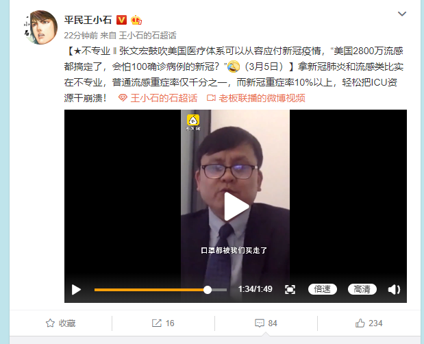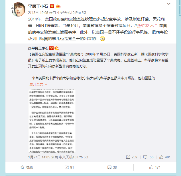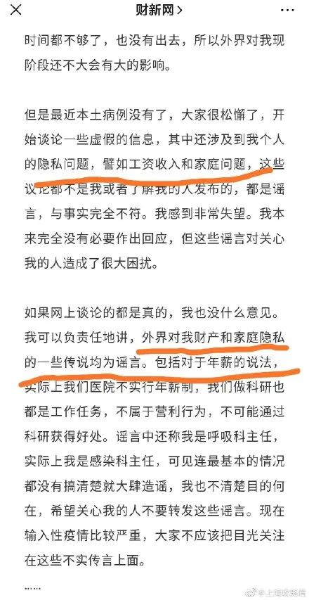 最后逼得张文宏不得不出来接受采访,表示这都是谣言。 ![]() 还有人说张文宏开豪车。 最后证明,他的私家车就是很普通的一款车,也是谣言。 且不说这都是谣言。 就算这是真的,张文宏也配。 要知道,张文宏可是华山医院感染科的主任。 而华山医院的感染科,在全国都能排入前三,而在复旦大学自己做的排名里,更是直接就是全国第一,高出第二名一大截: ![]() 阿里员工到了P9,年薪基本都百万以上了。 大部分你听过名字的明星艺人,无论多小,一年都能拿到一百万以上。 上面的张小石,他一年的微博广告,绝对在两百万以上。 而许多知名艺人,光是一张照片的授权广告费,可能就在百万以上。 怎么中国最好的感染科室的主任,一年就不配一百万了呢? 如果他们觉得不配,那其实是寒了中国所有医生的心。 很多人都明白这个道理,加上那些确实是谣言,所以他们那么多次造谣带节奏失败了。 这次好不容易给逮到一个把柄,可不得多做几个帽子给他戴上? 3,他们为什么这么恨张文宏? 很简单,因为张文宏说实话,不爱沸腾体,不爱阴谋论,影响到他们赚钱了。 比如前段时间上海的新增一直是0,包括我在内的许多人,都沸腾了。 然而张文宏却说: ![]() 他说“现在外地的,外国的,每天这么多人进来上海,新增怎么可能是零呢?” “经济复苏了,但我们不能放松警惕”。 然后在多次接受采访的时候,他都在强调,现在要多把注意力放在外来输入病例上。果然,现在每天最多的,就是外来输入病例。 比如从1月底开始,这些军事自媒体,就一直在说,病毒是美国人研究出来,传播到武汉的: ![]() ![]() 然而张文宏的判断却是,这种说法不靠谱。 因为如果病毒是从美国流出来的话,那不会初期只在武汉集中爆发,而应该在世界许多城市同时爆发。但现在明显是武汉先爆发,其他地方后爆发。在没有证据的情况下,不能证明病毒是起源美国的。 再比如,当时全国4万多名医护人员援助武汉,这些军事媒体说,这就是中国优越的地方,集体沸腾。 而张文宏说的是: “要把医生当人。” “医务工作者缺的是关心。” “不能欺负老实人” ![]() ![]() ![]() 还有美国感染人数激增,有些人为此欢欣鼓舞。 |