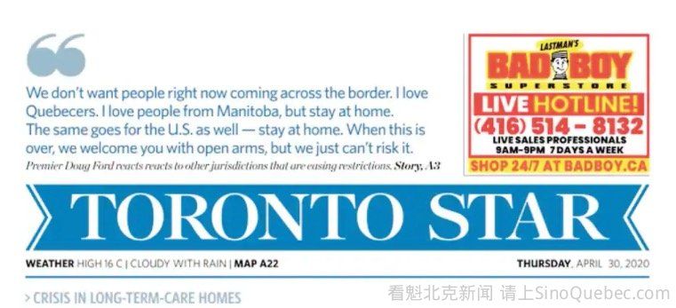 著名政论杂志<麦克林(Maclean)>说,魁北克仍然是“加拿大大流行的中心”,而蒙特利尔仍然是“北美流行最严重的中心之一”。 但是,就在这种形势下,魁省省长Francois Legault强力推行复工复学,受到加拿大英语媒体的严厉批评,该计划被比作掷骰子或俄罗斯轮盘的赌博形式。 安大略省的报纸讽刺说:“魁北克再次表明,它正在形成一个“独特的社会”,但是方式非常糟糕。 《多伦多太阳报》日报指责魁省省长想与“魁北克的儿童一起玩俄罗斯轮盘赌”。 专栏作家马克·博诺科斯基(Mark Bonokoski)在4月30日的专栏中写道:“如果我是魁北克省的父母,那么让我的孩子在5月11日回到学校是不可能的事。因为我从来都不喜欢俄罗斯轮盘赌,赔率非常高,赢面只有六分之一。” 原文 《国家邮报》预测,在接下来的几周内,全国其他地区的目光都将集中在魁北克。 新冠病毒都多、死亡人数也多的魁北克,却比本国其他地方更快地重新开放企业和学校。“与其他省份的决定形成了鲜明的对比,其他省份决定放慢速度,即使那些不再有新病例的省份,也是如此。” 《环球邮报》报道说:“安大略省的谨慎态度与魁北克大胆态度形成了鲜明的对比。” 安大略省省长道格·福特在4月30日发表于《多伦多星报》头版的一篇报道中说。“我爱魁北克人,但要留在家里,” ![]() 记者罗西·迪曼诺(Rosie DiManno)表示:“如果学校重新开放很快导致第二波蔓延和死亡,而不得不第二次限制民众外出,Legault政府将承担责任。” 《卡尔加里太阳报》称赞阿尔伯塔省省长詹森·肯尼的经济刺激方案。 专栏作家里克·贝尔(Rick Bell)写道:“统计数据表明,阿尔伯塔省不会成为下一个意大利[...]。我们甚至不可能成为下一个魁北克省。“ |