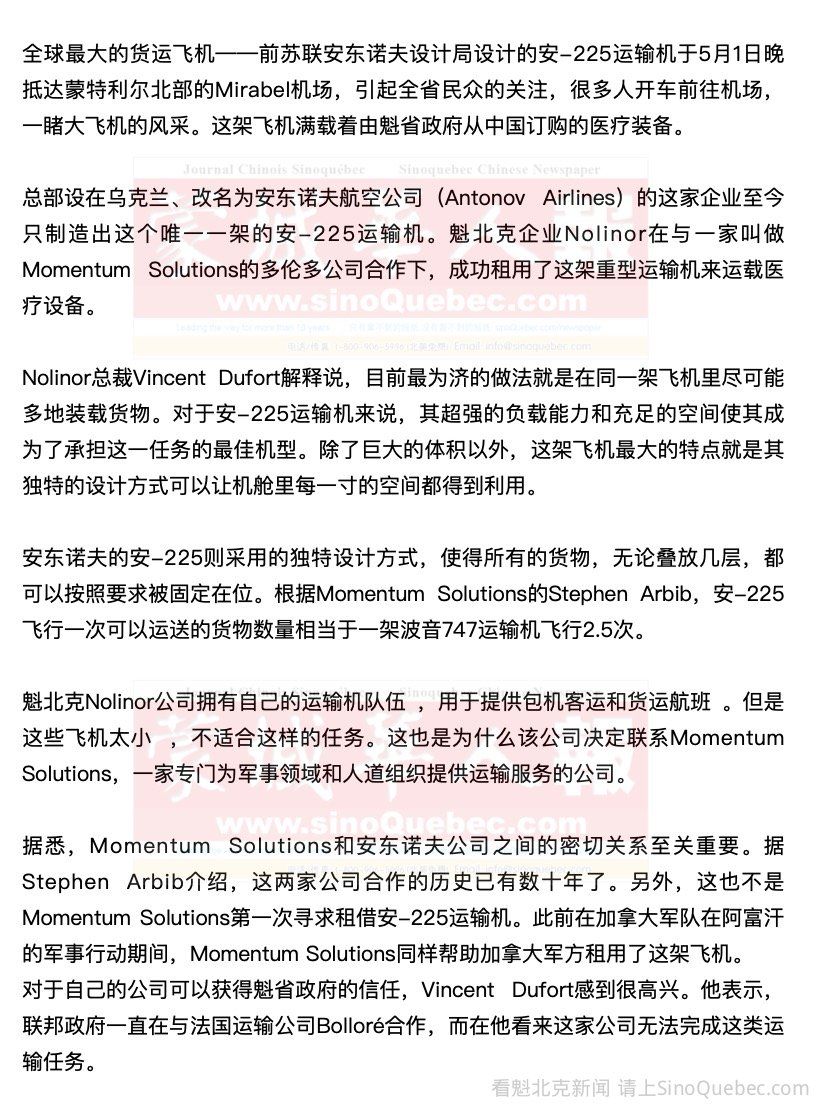 如今,从中国购买并运送医疗设备有着很多的潜在问题,加拿大和其他一些国家曾有过派出运输机去接纳购买的医疗设备,结果飞机却空手而归的情况。 Vincent Dufort表示,完成这样的物流工作需要在中国当地有眼线和足够的人手,以确保运输工作可以顺利的进行。对于那些坐在自己位于蒙特利尔家里里,仅仅在网上点击几下就想完成购买大批医疗设备并确保成功送到加拿大的人实在是太天真了。 Momentum Solutions利用其发达的人际网络在天津地区雇佣了一些人手,而天津机场是中国唯一一座有能力接纳安-225重型运输机的机场。安东诺夫公司派人在现场负责组建机舱里的库存设施、并且于4月28日早晨将到达机场的货物装载到飞机上。 另外, Western Global公司的MD-11 飞机从上海出发,在东京和阿斯加中途停留后,于4月28日降落在Mirabel机场,卸下了大约200万个口罩。承担此笔交易的 OEC集团首席执行官Marc Bibeau透露,该公司在6月底前将有约五十架包机,将中国购买的医疗防护用品运至Mirabel、Dorval和多伦多。 Marc Bibeau的公司过去主要运输体育用品和汽车配件,现在在全球个人防护装备竞赛中扮演了重要角色。在中国,OEC大约有20个仓库。 |
