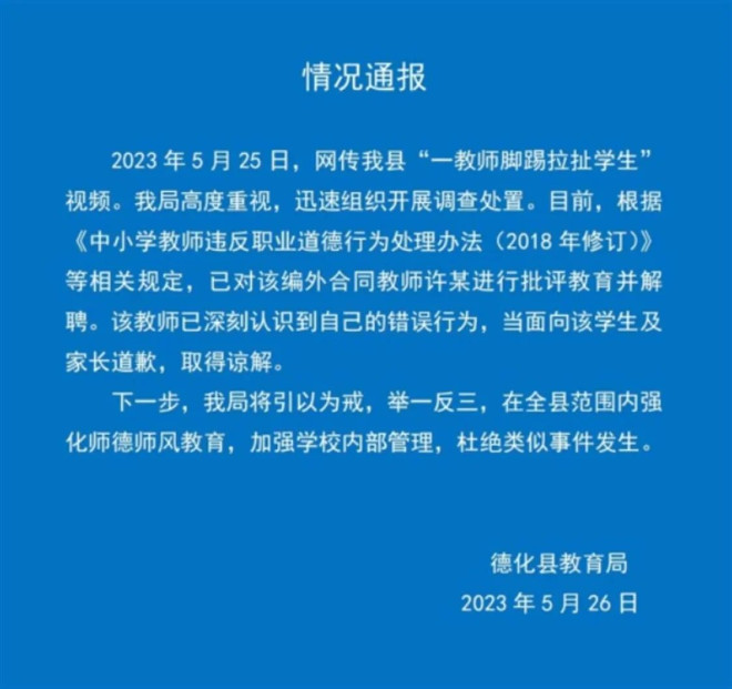 5月25日,福建。网传一小学女生在教学楼走廊甩手无意碰到老师,结果被老师用脚踢并揪住衣领拖进教室。5月26日,德化县教育局发布通报称,涉事者许某属编外合同教师,已解聘。 ![]() 学校监控显示,一名女老师在过道上走着,一名女学生不小心手碰到了女老师的肚子,结果女老师就用脚踢孩子,并把她揪进了教室。至于她将学生揪进教室后还做了什么,人们无从得知。 现在当地通报称,许某是编外合同教师,已解聘。 这件事让网友愤怒,就是错的一方不是学生,而是许某自己。视频显示,事发时她一直在看手机走路,女孩在和另一男孩戏耍时,转身小手不小心碰到了她的腹部,但老师一连串的暴力行为,让网友都惊呆了。 关心和爱护学生,是当老师的前提,哪怕就是学生错了,也应该以教育为主,不该下此狠手。网友纷纷呼吁当地有关部门严肃处理涉事老师。 ![]() 当地通报称“许某是编外合同教师”,学校是教书育人之所,教师应该有教师的样子,不管是合同制教师还是有编制的教师,都应该有一样的标准。哪怕一时间让这样的教师进了学校,学校也有责任对他们进行相关教育,对他们的言行保持密切关注,如果出现苗头,就应该及时制止、及时处理,以免发生这样的恶劣事件。 客观说,这则通报也有一些遗憾之处,没有说明事发的日期,也没有说明许某在教室里对学生做了什么、学生受到了什么样的伤害。 一些网友认为,视频在网上被发出来,是因为学生家长对学校处理不满意。从通报来看,视频在网上热传之后,教育部门才“迅速组织开展调查处置”。这之前,涉事学校和教育主管部门是如何处理的? |