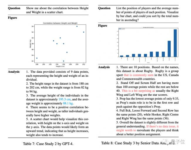 GPT-4替代初级数据分析师的成本只有0.71%,换成高级数据分析师则是0.45%…… 你没看错,是百分之零点七一,不是百分之七十一。 按新加坡行情,年薪8.6万-9万美元(60-63万人民币)的高级数据分析师,换成GPT-4就只需要三四百美元(2000多人民币)了。 这项结论来自阿里达摩院与新加坡南洋理工大学的新论文,被网友评价为对AI和数据分析领域感兴趣的必读论文。 具体来说,结论中高级分析师指在金融行业拥有多年工作经验的数据分析师。 而GPT-4的表现,在大多数指标上能与一位6年工作经验的人类相当,正确性低于人类,但复杂性和一致性指标高于人类。 在与另一位5年工作经验的分析师对比中,GPT-4在信息的正确性、图表的美观性、洞察的复杂性等方面输给人类。 如果与2年工作经验的初级分析师对比,GPT-4在正确性上表现更好,而且能完成更多的工作。 ![]() 但GPT-4完成所有类型的任务都要比人类快得多。 在假设每个月有21个工作日,每天8小时工作时间,按市场价支付工资的前提下,得出最终结论。 ![]() GPT-4当数据分析师,都能干什么 论文重点考察了GPT-4作为数据分析师的以下几种能力: 从数据和外部知识源中分析数据,得出结论 ![]() 200个样本的实验表明,对于绘制图表任务,GPT-4能够理解指令含义,且对图表类型有一定背景知识,从而绘制出正确的图表。 图表大部分清晰可见,没有任何格式错误,图标的美观性指标满分3分,GPT-4平均得分2.73。 但手工检查还是能发现一些小错误,图表准确性指标满分1分,GPT-4平均得分0.78。 论文中特别说明他们的评估标准非常严格,只要x轴或y轴的任何数据或任何标签有错误,都要扣分。 ![]() 对于数据分析任务,GPT-4在一致性和流畅性中平均得到满分,验证了生成流畅且语法正确的句子对GPT-4来说绝对不是问题。 有意思的是,到了数据分析这一步的准确性要比图表信息的准确性高得多,说明尽管GPT-4画了错误的图表但分析出了正确的结论。 ![]() 在案例分析中,研究团队还总结出三条GPT-4与人类数据分析师的主要区别: 人类分析师可以用个人思想和情感来表达,比如在分析时写“令人惊讶的是……”;人类读者容易从这样的表述中理解数据是符合预期还是不正常的。 人类分析师倾向于结合背景知识得出结论,如写到“……常见于……”;GPT-4通常只关注提取到的数据本身,允许GPT-4上网搜索实时在线信息可以改善这一点。 ![]() 当提供见解或建议时,人类分析师倾向于保守,如声明“假如数据没有问题的话……”;GPT-4会以自信的语气直接给出建议,不会提及假设。 另外团队表示,由于预算有限,主要是雇一个来与GPT-4对比的高级分析师太贵了,人工评估和数据标注的数量相对较少。 在最后的结论则是: 实验结果和分析表明,GPT-4在数据分析上有与人类相当的性能,但是否可以取代数据分析师需要近一步研究才能得出结论。 |