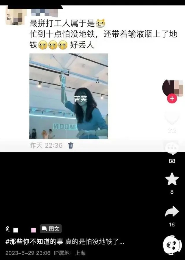 近日,网上有一段“女子举吊瓶乘地铁”的视频引发网友关注。 ![]() 5月28日,有网友在上海地铁站内遇见一名女子,她右肩上挎着包,右手高举吊瓶,吊瓶里还有一半的药剂。 29日,拍摄这段视频的熊先生告诉记者,当天晚上10点多,他吃完夜宵换乘地铁,下扶梯时看到该女子。刚开始他以为是饮料瓶,仔细一看,发现另一只手还扎着针。 他猜测女子是在医院打针,有重要的事情去做,才会举着吊瓶坐地铁。 “就感觉在上海生活挺不容易的,看了挺难受,有点心酸、心疼。”熊先生称,幸好这位女子旁边有一个朋友帮她拿东西,不然这种左手打针、右手举吊瓶的情况下,真不好用力。 视频发出后,有网友认为无论什么事,都没有健康重要,爱惜身体应该放在第一位。 但熊先生表示,非常能理解她的行为,女子肯定是权衡之后,认为有更重要的事需要去做。他还说,如果自己遇到急需解决的问题,可能也会这样做。 他称,自己的工作比较辛苦,目前也面临着买房买车、娶妻成家等现实压力,能理解该女子的选择。 “有一些不好的揣测或评论,不想过多回应,每个人经历不一样,认知就不一样。拍下的时候,我就是感觉大家都不容易。” 记者注意到,网络上有疑似视频中举吊瓶的女生“东东”现身,留言称“赶最后一班地铁,住的(得)太远了”。 ![]() 5月29日晚,“东东”发帖称“真的是怕没地铁了”,并附上前一天(5月28日)的朋友圈截图:一名身穿灰衣的女生在某工作室内打着吊针,配图文字为:“最拼打工人,忙到十点怕没地铁,还带着输液瓶上了地铁,好丢人。” ![]() 5月30日下午,记者与“东东”取得联系。她告诉记者,5月28日晚上10点左右,在地铁站内举着吊瓶的女生就是自己,最近生病高烧了三天,目前已经退烧。 “我第一天是在医院打吊针的,打到了凌晨两点,就让医生开药签字带回家了。”“东东”告诉记者,她目前是一家舞蹈工作室负责人,创业初期每天下班很晚 ,如果去医院输液要折腾到半夜,第二天一早又要起来去工作。“工作室我必须盯着,所以没办法再去医院输液。” ![]() “东东”透露,因为她以前从事过医护工作,之后两天她都是自己给自己输液,网络上流传的视频,是28日在工作室给自己输液以后赶地铁的画面。她住的地方距离市区20多公里,当时不想浪费钱打车,也不想浪费药水,又不是很清楚地铁到几点结束,夜里怕赶不上,于是就举着吊瓶直奔地铁站了。 “东东”也意识到自己的行为不妥。她表示,输液过程中不可控因素太多,大家千万不要模仿:“生病就应该去医院,健康最重要。” 网友:生活不易 网友纷纷表示心疼 ![]() |