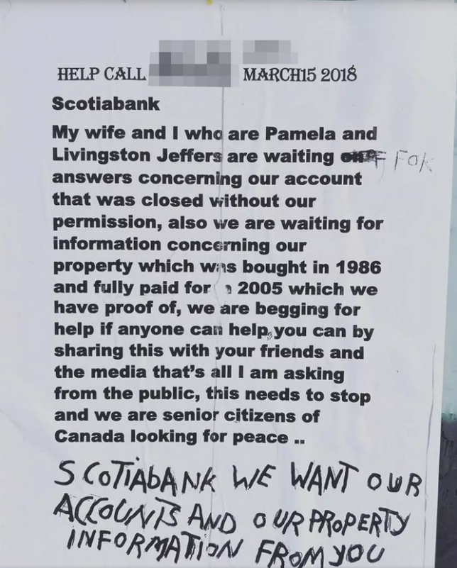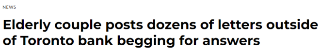 最近,士嘉堡的一对老夫妇在一家丰业银行外张贴了数十封信,要求该银行对于未经他们同意就关闭他们银行账户的事给予一个解释。 ![]() ![]() 图源:Daily Hive 在Markham Road和Ellesmere Road附近的丰业银行分行的玻璃门上张贴了数十张一模一样的信件。 信中写道:“我和我的妻子,Pamela和Livingston Jeffers,正在等待答复。” “我们正在乞求帮助。希望有人可以与你的朋友和媒体分享这件事,”信中继续说道。 ![]() 图源:Daily Hive “丰业银行,我们需要你提供我们的账户和财产信息,”信件底部的潦草字样写道。 ![]() 图源:Daily Hive 除了已关闭的银行账户外,这对夫妇还表示,他们正在寻找有关他们于1986年购买并在2005年之前全额付款的房产的信息。 “我们是寻求和平的加拿大老年人,”这两位老人写道。 早在2020年,这对夫妇就曾声称杜兰区警察和Lakeridge Health Ajax Pickering医院的工作人员在2018年10月的一次对峙中袭击了他们,从而登上了头条新闻。该事件的一段视频显示,两名警官对Livingston进行了殴打,当时Pamela一直在旁边哭泣,并拒绝工作人员试图将她带回医院。 然而,独立警察审查主任办公室(OIPRD)和约克警方表示涉事警官没有任何不当行为。 |