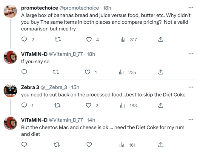 随着食品价格的飙升,选对了超市,可以帮助你节省很大一笔钱。对于大多地区的人来说,Loblaw旗下的超市几乎覆盖了每一个社区,但在通货膨胀问题上,它一直被吐槽。 这个连锁超市巨头经常在Twitter上被人们抱怨所谓的折扣价,根本没有诚意。比如之前2个5刀的产品,现在2个9刀还说是特价。 ![]() 图源:Twitter 相信很多人都好奇,连锁的Loblaws超市与Costco这样的大卖场相比,价格到底如何?哪一家更便宜? witter用户@Vitamin_D_77最近分享了一张照片,形象地说明了在两家超市花100刀能买到多少东西。 帖子写道:“左边是Costco的100刀,右边是Loblaws的100刀。” ![]() 图源:Twitter@Vitamin_D_77 右边的两个箱子里Loblaws的东西看起来较少,有小胡萝卜、奇多、一些派,还有一些看不太清楚的小件产品。 左边的Costco的箱子里装了大量的面包、香蕉、大瓶的果汁、两包可乐等等。 第一眼看照片可能就会觉得Costco是赢家,但在评论区,一些网友并不认同。 ![]() 图源:Twitter@Vitamin_D_77 一位网友说:“一大盒香蕉、面包和果汁与零食、黄油等相比?你为什么不在这两个地方买同样的东西并比较价格?这不是一个有效的比较,但是一个不错的尝试。” 另一个人说他都不会在这两家商店购物:“对于一个人来说,Costco仍然非常昂贵。” 值得一提的是,Costco1.5刀的热狗和汽水组合常常受到大家的赞扬。而Loblaws旗下品牌众多,差异也较大。 ![]() 图源:savealoonie 你喜欢在哪里购物?Costco、Loblaws,还是两者都不选? |
