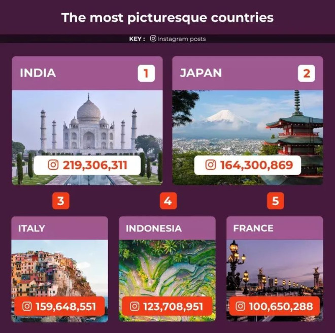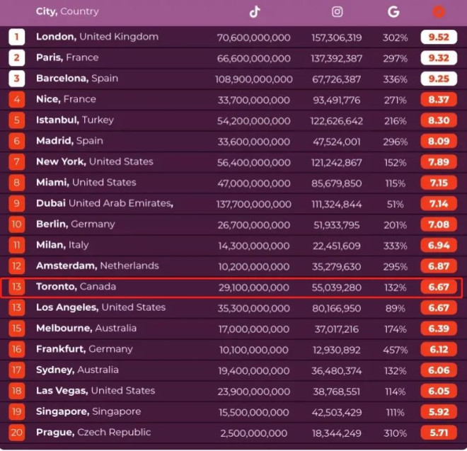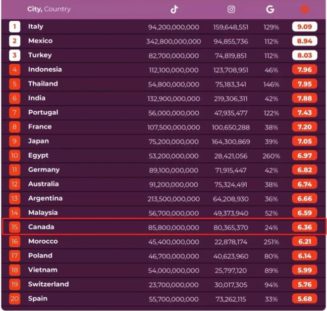 加拿大又被评为全球最受游客欢迎的国家之一。 由于社交媒体已经塑造了人们和世界互动的方式,改变了工作、购物和与朋友交谈的方式,甚至也改变了旅行方式。旅游公司Titan Travel为此分析了Instagram世界上最受欢迎的目的地的数据,以确定被游客和居民认为最美丽的目的地。 ![]() 世界最受游客欢迎的国家榜单 在综合社交旅游榜上,加拿大排名第15位。 意大利被列为总体上最受欢迎的国家,除了是Instagram上最受欢迎的国家之外,意大利也是谷歌上搜索最多的目的地。世界上第二受欢迎的地方墨西哥,有更多的TikTok浏览量。 ![]() 最受欢迎的城市榜单 作为社交媒体上最受欢迎的旅游城市,伦敦占据了榜首位置,成为都是最上镜的城市,以超过1.57亿的Instagram帖子占据榜首。它也是TikTok上浏览量最大的城市之一,排在第三名。 巴黎位居第二, 这个世界上最浪漫的城市在TikTok上的浏览量也排名前五。 排名第三的是巴塞罗那,也是TikTok上最受欢迎的城市之一。 ![]() 而加拿大多伦多列为第13位。 ![]() 最上镜的国家榜单 在最相镜的国家榜单中,加拿大幸运地排在第7位。 印度拥有充满活力的大都市,如德里和孟买,其南部海岸线上有棕榈树环绕的海滩,以及泰姬陵等标志性建筑遗址,印度在该榜单中名列第六。有超过2.19亿个帖子专门介绍这个国家和令人敬畏的美丽。 日本紧随印度之后,以惊人的1.64亿个帖子在社交媒体平台上发布照片,位居第二。这个国家拥有令人瞠目结舌的自然地理环境,包括令人惊叹的富士山山坡,以及充满迷人流行文化的繁华城市,如东京的原宿区,一个时尚爱好者的圣地。 欧洲最受欢迎的目的地之一意大利在Instagram上发布了超过1.59亿条帖子,位列前三。这个地中海国家以其美食、时尚和 "绵延千年的丰富历史 "而闻名,其迷人的海岸线和田园诗般的乡村每年吸引了数百万游客。 印度尼西亚在名单上排名第四,法国紧随其后排名第五。墨西哥占据第六位,而加拿大幸运地落在第七位。 澳大利亚排在第八位,泰国排在第九位。土耳其在前十名中名列前茅。 ![]() 墨西哥是TikTok上最受欢迎的国家目的地。 ![]() 迪拜是TikTok上最受欢迎的城市,这个阿联酋首都的TikTok浏览量超过1377亿。 ![]() 对于游客兴趣提升的城市,里斯本、法兰克福和巴塞罗那排名前三,其中里斯本的搜索量增长高达500%。 ![]() 对于游客兴趣提升的国家,埃及排第一。 ![]() |