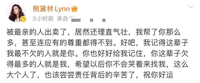 6月14日,知名女星熊黛林突然在自己的各个社交账号上发文,自曝被最亲的人出卖,语气相当愤怒引发网友热议。 ![]() 从熊黛林发布的动态中可以得知,她帮助这个“最亲的人”做了很多事,没想到却遭到背叛,而且对方理直气壮,甚至连应有的尊重也不给她。 因此让熊黛林气得不行,忍不住在社交账号上放狠话,称“我记得这辈子我最不欠的人就是你。你也给我好好记住,你这辈子欠得最多的人就是我,希望以后你不会哭着来找我,这么大个人了,也该尝尝责任背后的辛苦了 ,祝你好运”。 ![]() 在大家的眼中熊黛林一直是一个情商很高的人,此前她的穿衣风格被网友吐槽,甚至双胞胎女儿被嘲长得不好看,没有遗传妈妈的基因,熊黛林也都没有生气,而是用高情商的话语回复大家。 ![]() ![]() 因此,熊黛林这次如此生气,甚至不惜公开放狠话,让网友们感到十分惊讶,纷纷猜测到底是谁惹怒了熊黛林。 在很多人看来,“最亲的人”的人无非是丈夫、父母或是兄弟姐妹,所以很多人开始担心,熊黛林的婚姻状况是不是出现了问题。 ![]() 众所周知,熊黛林曾和郭富城谈过7年恋爱,没想到分手后对方说出了一番“鞋子”言论,并转头迎娶了网红方媛。 ![]() 好在,熊黛林也不是一个纠结于过去的人,郭富城结婚第二年,她也嫁给了男友郭可颂。 据悉,郭可颂是演员郭可盈的弟弟,家境优渥,是一个标准的富二代,本人也在家族企业工作,身价上亿。 ![]() 2018年,熊黛林为郭可颂生下一对双胞胎女儿,夫妻俩的感情在外界看来一直非常恩爱,前不久他们还带着妈妈以及两个孩子一起外出旅游。 ![]() 除了郭可颂外,熊黛林的哥哥也遭到网友怀疑。不过,熊黛林的哥哥比她大7岁,从小一直很宠爱妹妹,所以部分网友认为不太可能是哥哥。 ![]() 虽然大家都有些一头雾水,但还是在评论中出声安慰熊黛林,让她不要为了不值得的人和事,气着自己。不管怎么样,希望熊黛林可以早日平复心情,每天都开心快乐。 |