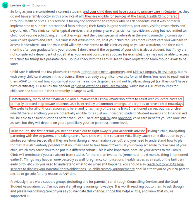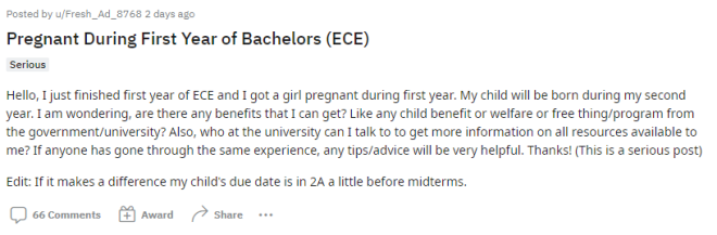 就在最近,中国留学生众多的安省滑铁卢大学“小火”了一把! ![]() 图源:滑铁卢大学官网 一名学生在2天前在Reddit发帖称:“我刚刚完成了工程学的第一年学习,但是在第一学年,我让一个“女孩”怀孕了。孩子将在第二学年出生。我想知道我可以获得什么福利吗?或政府/大学提供的免费物品?我可以与大学里的谁联系以获取信息?如果有人经历过同样的经历,你们的建议都会非常有帮助,谢谢!” “另外,我孩子的预产期是2A期中考试前一点,是否能有办法干预呢?” ![]() 图源:滑铁卢大学官网 发帖学生强调这是一篇严肃的文章。 帖子发出后,收获了大量的关注,以及数十条正式和非正式的回复,甚至在一定时间内,小小刷屏各大社媒。 最高赞的回复详细分析了目前的情况,以及发帖人的孩子可以获得的福利:“只要是在校学生的孩子,他们就有资格获得健康服务。包括但不限于:儿童疫苗、每年体检,以及专家转诊。” ![]() 图源:AboutKidsHealth “不幸的是,滑铁卢大学许多用于帮助支付儿童保育费用的福利和助学金主要针对研究生,因为在本科生中生孩子是非常罕见的。 “您需要立即联系的第一个人是您的学术导师。生孩子、养育子女、照顾孩子可能会对学习造成一些干扰(特别是如果他们出生在考试期间),你需要了解如何对此进行计划。您也有可能需要请假来照顾孩子。” ![]() 也有网友提到了很多福利:儿童保育、电费退税、免费婴儿物品等等。 然而,这篇帖子在转发到华人社媒平台时,很多华人网友对于这样的“想福利”行为表示不齿! “孩子是女孩怀、女孩生,他还想拿免费福利?” “儿童福利金都是跟着妈妈的,他想太多了。” “他等着协商抚养费,或者等着被告就好了!” ![]() 图源:pregnancy Insurance for International Students 也有人表示这很正常:“我12年级毕业时,有人抱着1岁的娃了!” 当然,也有几名网友发现了“盲点”! “根本就不是把女朋友搞怀孕了,而是把一个女孩搞怀孕了!” “Got a girl pregnant听起来也不是正常交往关系,否则就会说女友/老婆了。既然不是common law/married关系,人家女孩生孩子和他也没关系啊!” 无论是否是女朋友/老婆,还是其他女性朋友,刚上大学一年级就导致女孩怀孕,并且因此会影响考试等等,这事你怎么看? |
