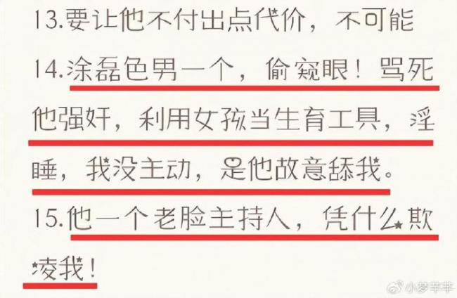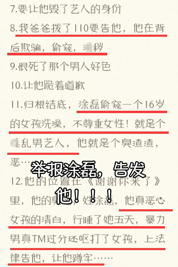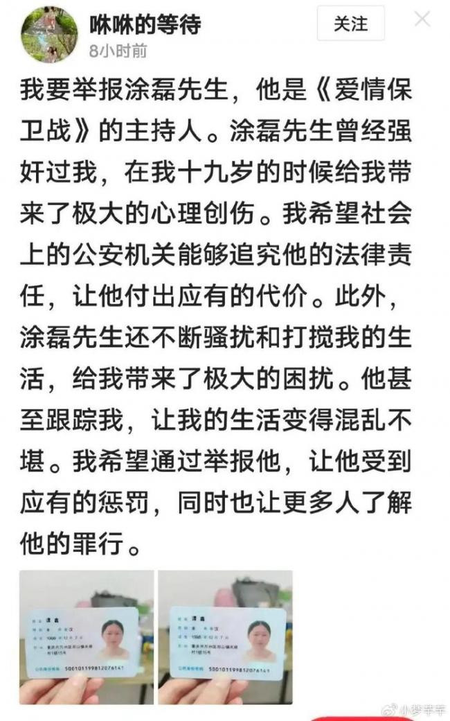 7月26日,娱乐圈格外热闹,在热搜榜单上,曝明星嫖娼被抓、岳云鹏经纪人疑似强奸被抓纷纷上榜,这瓜一个比一个猛。 ![]() 先是郭德纲小舅子、岳云鹏经纪人王俣钦被曝涉嫌强奸被抓,风波发酵了几个小时德云社都没有回应,也让此事变得扑朔迷离,而后媒体打电话向本人求证,王俣钦的电话显示无法接通。 岳云鹏经纪人的事情还没定论,又有明星塌房了,爆料称有明星在晚上10点半左右嫖娼被抓了,地点是朝阳区,爆料者表示他亲眼目睹了这位明星的经纪人与酒店沟通,还晒出1207房的照片,门口确实站着一个人,不过打码处理了。 ![]() ![]() 因为王一博突然取消了行程,表示是工作太累导致身体不适,所以很多人猜测是不是他,加上他发布的文案很不像自己的风格,不过有狗仔澄清,说有点人脉不是王一博。 ![]() 然而在舆论热议中,又有一位主持人被实名举报涉嫌强奸,就是以“犀利点评”走红的主持人涂磊。 ![]() 这位网友明确表示涂磊曾对她有不轨行为,在他19岁的时候曾强奸过她,此外,涂磊还不断骚扰并打扰她的生活,给她带来了极大的困扰,甚至还跟踪她,让她的生活变得混乱不堪,她实名举报希望让他得到应有的惩罚,同时也让更多人了解涂磊的罪行。 ![]() 这位女网友晒出手拿身份证的照片,上面显示她叫谭鑫,1998年出生于重庆,今年25岁,她19岁遭到涂磊的骚扰,那应该是2017年发生的事,不知出于什么考虑,谭鑫当时没有发声而是6年后再站出来,所以这件事究竟是真是假暂时不好下结论。 ![]() ![]() 谭鑫还罗列了十多条有关涂磊的“罪行”,确实让人看后触目惊心,更多的是难以置信。 她表示当时事情发生后,她爸爸有拨打110告他,只不过谭鑫只是文字表达,没有拿出实质性证据来证明当时报案了。 ![]() 谭鑫还直言恨死涂磊了,爆料他还曾偷窥一个16岁女孩洗澡,非常不尊重女性,甚至说他私生活混乱。 提到强奸的细节,谭鑫透露当时和涂磊睡了五天,这期间还遭到涂磊的暴力殴打。 ![]() 另外,谭鑫怒骂涂磊是偷窥眼,利用女孩当生育工具,她也没有主动过,都是涂磊故意舔她。最后质问涂磊为什么欺凌她,她会不惜一切让涂磊付出代价。 ![]() 截止到目前,涂磊就此事还没有回应,而爆料女孩删除了多条动态,账号名也更改了,不知后续她还会不会继续发声,看到她只是文字爆料,连和涂磊的合影都拿不出,很多人质疑她爆料的真实性,毕竟这么严重的事情,不能只听一面之词。 有网友表示,涂磊已经两天没更动态了,是不是不敢发声,翻看他最后一条动态,他已明确告知媳妇生病了,这几天一直往医院跑,所以断更的原因是陪媳妇看病去了,并非是害怕躲起来了。 ![]() 从这个女孩爆料的时间看,事情发生在2017年,而涂磊的女儿2016年出生,并非是发生在媳妇怀孕期间,而且都知道涂磊和妻子“小丸子”的感情非常好,两人2005年在一起,2009年结婚,风风雨雨走过了18年,这期间涂磊经常表白妻子。 他在2017年曾被造谣离婚,当时涂磊火冒三丈,表示绝不允许这些造谣者恶意传播,会坚决追究信息来源,他还晒出多张与妻子的合影,看上去非常恩爱。 那一年,涂磊也经常晒出与女儿的合影,更是频繁提到妻子,看上去一家三口恩爱又幸福,完全看不出他有任何出轨迹象。 所以,在谭鑫拿不出证据之前,网友不要轻易下定论,如果真的是受害者,一定要拿出让大家信服的证据,如果是造谣,也将得到相应的惩罚,蹲个后续。 |