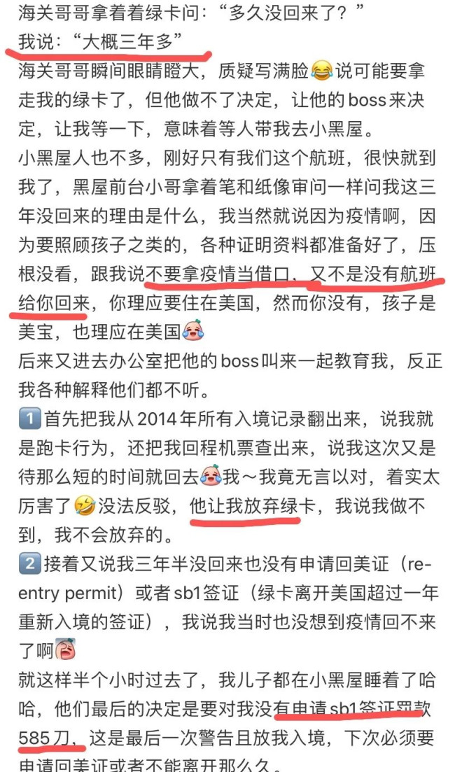 很多在美华人喜欢保留绿卡,选择不入籍,主要原因是因为往返中美两国更加方便,无需签证。 但说走就走的背后,也是要有条件的。 昨天,一位网友在网络上分享了自己持有绿卡入境洛杉矶被请进“小黑屋”的经历,所幸的是这位网友有惊无险,最终顺利入境,但是还是被罚款了585美元! 究竟发生了什么呢? 原来这位网友持有绿卡,长期居住在中国,疫情前经常会美国小住一段时间,但赶上疫情这几年,就一直没回来过,这次带着美国出生的宝宝回美国。 以下为XHS网友发帖: ![]() ![]() 这位网友的经历可以说有惊无险,但是他也在最后提醒大家如果长时间离开美国,绿卡申请者要申请回美证。 回美证是华人的统称,细分又分成回美证,英文叫做Re-entry Permit,还有一种叫做回美纸Advance Parole,两者的区别是前者是必须绿卡,后者可以等待绿卡身份的民众(485身份调整中)。 如果美国永久居民(绿卡持有者)预计将在美国境外连续呆超过6个月,或者最近1、2年在美国境外累计时间超过80%以上,或者最近一次入境被美国海关警告出境时间过多,对于这些人群建议申请回美证。 ![]() 对于10年永久绿卡持有者而言,如果提交申请前5年内或者获得绿卡开始到提交申请之日截止这段期间内(以时间较短者为准),在美国境外的时间没有超过4年,则获得两年有效的回美证,如果超过4年,则获得一年有效的回美证。 对于2年临时绿卡持有者而言,获得的回美证的过期日期等同于绿卡过期日期。对于正处于2年换10年绿卡阶段的申请者而言,获得的回美证的过期日期等同于绿卡延期信上的过期日期或者护照上I-551临时绿卡章的过期日期。 如何申请回美证? 需要填写I-131表,其它就是按照规定提交一些证明,包括护照,签证,入境信息等等,当然还需要申请费用。移民局收到后会要求打指模,有些人有记录就不用打了。 在回美证是否可以在海外申请的问题上,多数律师都表示不可以,也有些律师表示一些特殊情况,比如紧急人道主义之下,可以在海外提交。 一旦收到,就可以马上离开美国了。当然,现在移民局压力这么大,可能办理会有延误,有长期回国打算的,需要民众提早做出规划。 长期以来,是否申请回美证问题上,网友们的态度不一。 有些人认为,完全没必要,每次长期离境都能顺利入关,而且网上顺利入关的确实很多。 ![]() 也有人有些血泪史,甚至不少人分享了自己因此被要求放弃绿卡,当然这也是一个漫冗长的过程,也不是海关说让你放就放的。 ![]() 事实上,没有人敢给大家做一个100%的保证,我们还是鼓励大家遵守要求,长期离境,申请回美证。 持有绿卡者大部分人都是在美工作和生活的华人,但是也有不少两边跑的跑卡族,除了有人在两边的工作外,很多移民的老人也是两国来回跑,往往会遇到在哪里生活183天的问题。 随着航班慢慢的恢复,我们会看到更多类似的经历,也希望大家根据自己实际情况早做规划,该申请证件还是要申请,不要存在侥幸心理。 |
