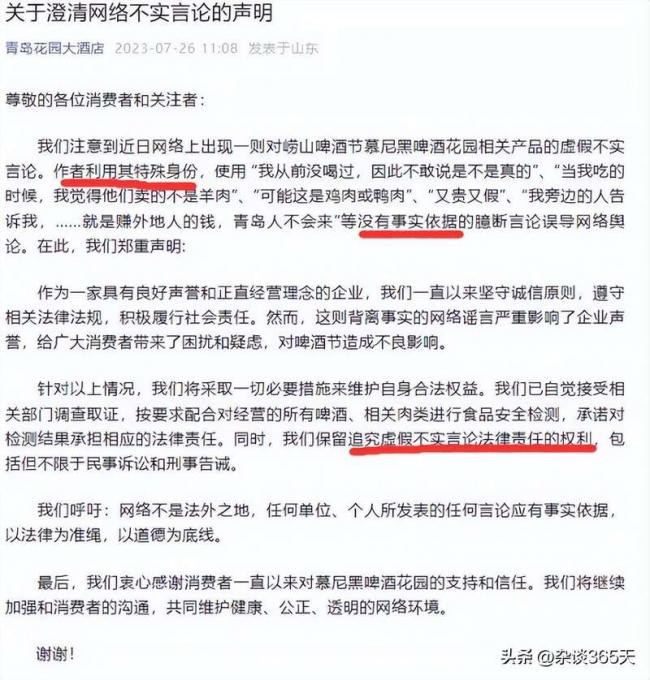 现在,第33届青岛国际啤酒节正在如火如荼的举行着,从7月14日开始,一直持续到8月6日。 举办方推出了大量的活动和节目,可以说是准备下大力气,将这次的啤酒节当成了当地的一张名片进行宣传。 但是,事情却有点事与愿违,一名来自德国的美女,将自己在啤酒节上不愉快的经历通过视频发布到了网上,直接引爆了舆论。 这名德国女子的中文还是比较流利的,看样子也是一个很喜欢喝啤酒的人,她吐槽青岛啤酒节的方面主要有三点: 第一点:当她看到有一个站台上宣传,他们的啤酒来自德国慕尼黑,是原装进口的啤酒。 能在遥远的中国喝到自己家乡的啤酒,该女子自然是很开心。但是当她真正喝了几口的时候,就彻底失望了。 他说展台宣传的这个所谓的“德国有名的牌子”的啤酒,自己在德国就根本没有听说过,所以“不敢说它是真的”。 而且这味道也不是德国啤酒的味道,关键是啤酒还有一点儿酸。 ![]() ![]() 第二点:喝啤酒自然是要吃烧烤的,德国美女也买了8串羊肉串。 但是该女子觉得,这根本就不是羊肉,自己也说不上是什么肉,不过可以肯定的是,这不是羊肉。 ![]() 更让女子无语的是,晚上刚喝完啤酒、吃完烧烤,第二天早上自己就拉肚子了。 第三点:这名女子觉得,啤酒节上的东西实在是太贵了。 自己和朋友要了两升啤酒,花了他们180元,而那8串所谓的羊肉串,居然花了他们120元。 看女子拿的羊肉串也不是很大,一串就要15元,确实不便宜。 ![]() 女子在视频的最后,气愤的用一句话总结了自己此次参加啤酒节的经历,那就是: 很不好,又贵又假! 随后青岛当地的一家酒店,疑似就是德国女子吐槽的展台,站了出来,反驳了女子的话,还表示将保留追究其法律责任的权利。 ![]() 结果就在7月28日,当地的文旅部门,以及市场监管部门,都做出了回应,已经介入进行了调查。 这下好了,事情彻底闹大了。 在网上闹得这么大,还牵扯到国际友人,估计后面的调查会十分的谨慎和公正。 我们就静静地等着结果出来吧! |