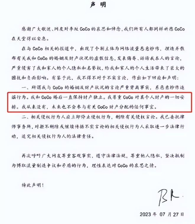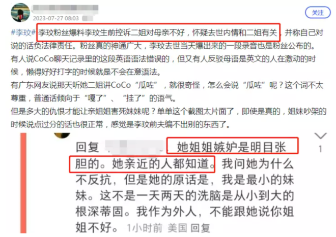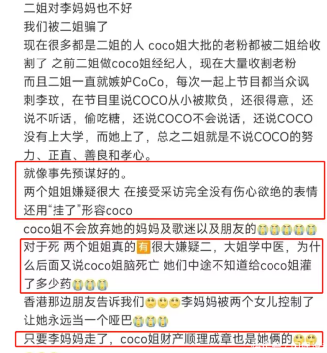 华语流行乐坛唱跳天后Coco李玟7月5日家中轻生骤然离逝,消息震惊整个娱乐圈,令人痛心不已。 李玟离世后,她的家人和其加拿大籍丈夫Bruce也是被曝矛盾重重,10亿遗产的最终归属问题更是闹得沸沸扬扬。 ![]() 7月28日,Bruce突然大动作发出声明,强调“不会参与分配财产”。 李玟离世后,隐身多时的Bruce迅速现身,先是发出讣闻喊话“挚爱的妻子”,不过没多久就被二姐打脸,表示“这是他发的不是我准备的”,之后就再度神隐起来。 直到现今突然发出声明,说明分产内幕。直言自己婚后与李玟一直财务独立,且完全不打算参与分产,认为是有心人士恶意炒作、捏造假消息,已委托律师追究法律责任。 强调自己从来没有想过争夺什么,也没有去奢求过什么,更没有所谓的贪婪之心。还透露自己连日来遭遇的舆论危机是有捏造并煽动舆论,故意营造他会来抢李玟遗产的假象,真实目的为何只有煽动舆论的人最清楚。 ![]() ![]() 但值得关注的是,在这份声明中对于被曝私藏礼服一事并未提及,也没有给大众一个解释,仿佛当事情不存在。目前距离李玟家人定下的48小时归还期越来越近,是否能够归还还未可知。 也有港媒报道,说有知情人表示,Bruce留下礼服也是想留下一些关于妻子的念想,毕竟夫妻一场,说没感情是不可能的,且李玟生前也从未公开指责过丈夫什么。 当然,也有网友质疑这份声明过于草率,因为连签名都是英文缩写,可能法律效力并不充分。 ![]() 而关于这份声明,《自由时报》报道,二姐李思林也已经回应称:“他发的声明请你问他吧,我不会代他说话。” 事实上,在李玟的正式讣闻中,因为不见Bruce的名字,就已经被外界质疑遭到她的家人切割,不过二姐对于此说法相当气愤,强调上面清楚写道“亲属繁衍 恕未尽录”,希望大家不要再去制造花边新闻,留给家属私人空间。 ![]() 二姐被扒“两副面孔” 在Bruce公开表态之后,大家便开始把矛头指向了李玟的二姐,认为此人心怀不轨,不然为什么总是针对这个外国男人? 在这个关键时刻,还有粉丝扒出二姐有“两副面孔”,在荧幕前她一直塑造自己是个好女儿,善待母亲,团结姐妹的好形象,岂不知私下里对母亲一点都不好,李玟生前也跟粉丝们控诉过二姐的行为。 ![]() 李玟的粉丝爆料,李玟二姐对母亲一点都不好,对李玟更是各种嘲讽和谩骂,李玟去世之后,二姐还曾用“挂了”这样不尊重的词来表达,仿佛在说别人的事一样。 而且在李玟头七那天,二姐竟然穿了红色衣服,作为至亲,妹妹去世穿红衣,这波操作真的有点神奇,令人匪夷所思。 不仅如此,二姐在节目中还总是说李玟从小被欺负,偷吃糖、不听话、没上过大学等,然后又洋洋得意说自己就读了大学,似乎故意突出两人之间的差距,但对李玟多年以来的努力、善良和孝心却只字不提。 ![]() ![]() 这些消息一经流出,二姐迅速冲上风口浪尖,无数网友指责她“两副面孔”不要太明显,甚至更有网友竟然怀疑她与李玟的离世有关! 之所以会有这样的怀疑,是因为大家觉得李玟去世后,所有的一切都像是事先预谋好的一样——先拉踩李玟的老公,用舆论逼其放弃争夺遗产,之后就是在李玟后事上亲力亲为,收割新老粉丝,让大家相信她是真心对李玟好。 ![]() 还有香港当地知情网友透露,李玟的妈妈被两个女儿给控制了,欲让李妈妈永远当哑巴。因为李玟的遗产留给了妈妈,如果妈妈走了的话,两个姐姐就顺理成章的继承了全部大约10亿财产,成为最大受益人。 只能说现在事情的走向似乎越来越荒唐了,所有喜爱李玟的粉丝都在等一个真相。 真心希望这些电视剧中的情节不要在现实中发生,愿Coco一路走好,在平行时空中获得安息。 |