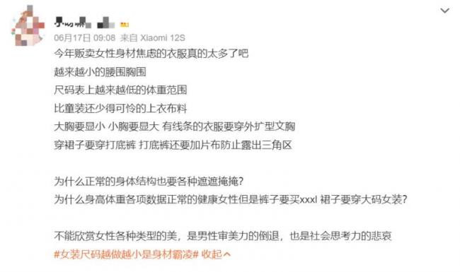 相信时常在国内淘宝的小姐妹们,最近应该都遇到了同一个诡异的现象,那就是自己好像莫名胖了!!以往S码就合身的衣服,现在居然得往M、甚至XL上买了。然而,上秤一称吧,这体重也没变啊!?? 这其中到底是出了什么问题?难道,大家一个疫情过了,骨架都莫名养大大大了???然而,就在中国网友还在那后知后觉时,美国网友早已领先一步,对中国的衣服尺码,发出了灵魂的拷问?? 一年前,名叫@jb.kwesi 的外国网友就曾在TikTok 疑惑不解,考虑到种族体格差异,他从中国买毛衣时,就故意买了最大码。结果,整整5个X的毛衣,穿上后居然还是小了。这离谱的试穿,让小哥内心一阵惊慌,然后开始质疑自己是不是真的很胖?? 而,同样被中国尺码“创”到的,还有一名叫Ana的美国网友。3年前,Ana 从中国购买了一条裙子,然而收到货后她却因此陷入了自我怀疑。 ![]() 当买了XXL号,却还是穿不下时,Ana 对中国尺码的认知就在那一刻上了新高度。 ![]() 咋说呢,这些年被中国尺码“卷伤心”的外国友人,真的是数不胜数!只要在tiktok上稍微一搜,那受害者真的是一片片,多到难以下脚。我在英国穿2xs,结果到了中国得穿L号 ![]() 有一次我要了 M 码,然后工作人员上下打量了我一番,然后给了我 XL 号 ![]() ![]() ![]() ![]() 其实吧!早几年中国尺码和外国尺码有点偏差也能理解,毕竟亚洲人体型普遍比欧美人小。但是,随着BM风的吹来,这中国尺码真的是越做越小,今年更是让正常亚洲人都难以理解,这衣服到底要给谁穿的程度!! ![]() 就说这离谱程度到底能有多离谱,甚至如今的衣服尺码小到,就连比正常人都瘦的女明星都穿不下。 ![]() 相信这一刻,不管是美国网友还是中国网友,应该都同时沉默了。 本来在亚洲,以瘦为美就成为了主流审美观。而如今随着一些网红商家的推波助澜,“白幼瘦” 更是成为了无数女孩追求的“潮流”。而此时,正常体型的女生便在无形中被“身材霸凌”。她们正常生活、正常运动,身材没有任何变化,然而衣服码子却越穿越大。这种潜移默化的影响,会让正常女性开始一步步走向焦虑,从而开始“变瘦”以迎合如今社会的畸形审美。说到底,这也是一种悲哀! 即使在美国……随着时间的推移,短款上衣也越来越短。就像女孩都身高5 英尺或以下一样,这是可悲和有毒的标准。 ![]() 是的,我在拼多多买了5XL的衬衫,还是不适合我,而在我的国家,L 码就够了 ![]() 一个女孩试穿了一件,然后把它送给了她的猫,它非常合适!!!!!!! ![]() 一个正常的社会,随着时代的进步,审美也应该多元化,而不是走向极端的“小众”。女性应该有自己独立的审美,而不是被“个别人创造出来的”身材焦虑所裹挟。 ![]() ![]() ![]() 女孩们,请记住一花独放不是春,百花齐放才能春满园!!你想怎样绽放,都是最美的时刻!! |