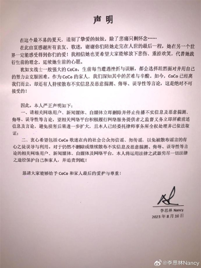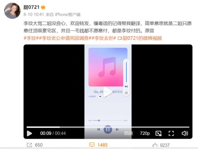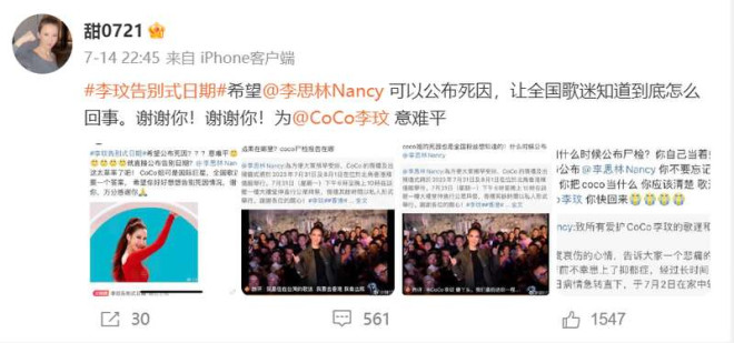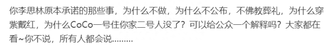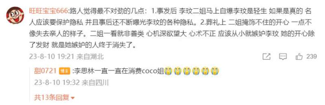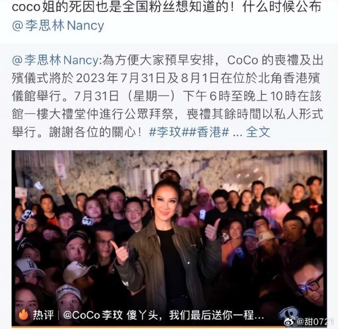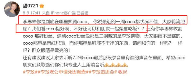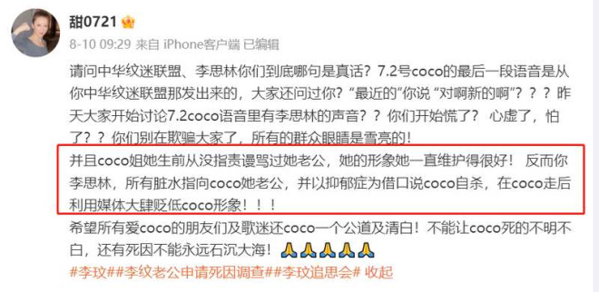 近日,一则疑似李玟生前的录音片段流出,引发全网哗然。 ![]() 内容疑似李玟痛斥自己的二姐Nancy是“吸血鬼”,每个月住着自己为她支付高额房租的香港(专题)豪宅,还要抱怨住宿条件不好,十分生气。 ![]() 音频里的确可以听出是李玟略带嘶哑的声音。 她情绪激动地说道:“Nancy什么事情都要抱怨,这里现在是我给钱,(一个月租金)六位数字啊,你以为很便宜吗,这里是香港的高级住宅白加道啊,PURE集团的CEO都住这里,因为贵,不是所有人都给得起的,扑街!Nancy天天抱怨这里多差多差,睡不着觉,可她一分钱都没给过……” ![]() 查询录音来源,发现这段录音最早是一个名叫“甜0721”的网友公布的,这名网友是李玟的骨灰级铁粉。 ![]() 约有1000多名李玟粉丝在这条录音下留下评论,斥责李玟二姐李思林是吸血鬼。 ![]() “李思林一直一直在消费coco姐。” ![]() 翻看该名粉丝的微博,发现她早在7月14日就开始质疑coco死亡的真相,并将矛头对准了李玟二姐李思林。 ![]() 她们质疑李思林的理由有以下几点: 1、李思林原本承诺要公布妹妹死因,却至今没有兑现承诺,只是一味地将妹夫Bruce推到台前,引导大家指责Bruce出轨。 ![]() 2、葬礼上二姐掩饰不住的开心,一点不像失去亲人的样子。 ![]() ![]() 3、coco生前从没指责谩骂过她老公,一直把他的形象维护得很好,反而李思林在妹妹死后,一直给coco老公倒脏水。 如果她的老公真的有这么坏,为什么不在妹妹生前出来手撕渣男? ![]() 4、李思林称coco去世前一周状态都不是很好,但歌迷发现李玟去世前才刚刚和好友聚餐过,照片中的她看不出什么异常, ![]() ![]() 5、coco7月1号住在酒店,2号回到二姐的家人就没了,这其中发生了什么不得而知。 ![]() 6、疑似李玟生前的一段聊天记录流出,内容是李玟用英文抱怨Nancy没有照顾好她的妈妈,助听器出问题都不管。 ![]() 7、7月2日爆出一段coco发出来的语音,当天粉丝询问歌迷会是“最近的吗?”,得到肯定的回答,然后当粉丝发现那段录音里有二姐的声音后,歌迷会就突然改口说录音不是7月2日的,而是6月11日的,变卦太快。 ![]() ![]() 总而言之,已经大批李玟歌迷表示逆反,申请调查李玟死亡真相。 李玟老公Bruce也站出来反击,表示不参与李玟遗产分配,并申请“死因庭”,要求调查李玟死因。 ![]() 李玟姐姐这边也看到了歌迷的种种质疑,她发布声明表示以上种种质疑全部都是谣言,要求相关方删除虚假言论。 ![]() 然而部分粉丝对这份声明并不买账,称她是贼喊捉贼。 ![]() 目前关于李玟去世原因的猜测,已经上升到了阴谋论的程度。 你们更愿意相信谁呢? |