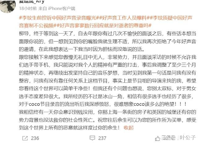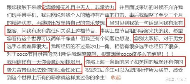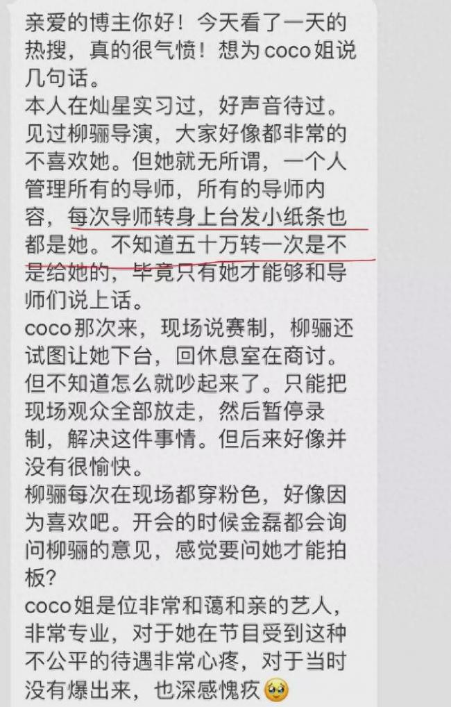 ![]() 近日,《中国好声音》的导演柳骊,因为不尊重和谩骂李玟,遭到了网友的人肉搜索。仅仅一天的时间,她的个人信息就被暴露在网络上。 ![]() 此前,柳骊被指在录制节目时,曾对已故选手李玟发表不当言论,引发网络追责。不过很快,柳骊就否认了此事,可网友们压根不相信,她的过往也全部被扒了出来。 根据网传信息,柳骊的身份证号、手机号、家庭住址、工作场所等个人隐私被挖掘曝光,其微信个人资料也被截图上传。 有网友爆料,柳骊在《好声音》担任导演期间,不但对李玟不尊重,其工作风格也不受同事欢迎,每次录制前,她都会私下给导师传递小纸条。 ![]() 一位名叫夏琨岚的女歌手,发布了一条爆料微博,矛头也直指《好声音》导演柳骊。 她在文中直接喊话柳骊导演:“柳导,终于等到这一天了。” ![]() 2022年,由于《好声音》节目组找到夏琨岚,想让她去好声音当选手,她因此和柳骊有了几次面试交谈。 但遗憾的是,这几次面试交谈都给夏琨岚留下了极其不好的印象,甚至到了“一想到见到你的嘴脸我就生理不适”的地步。 之所以让夏琨岚感到不愉快,是因为柳骊待人接物十分“傲慢无礼,目中无人,非常势利”。 ![]() 夏琨岚表示,她每次和柳骊面谈时都不被允许带手机。当时,柳骊导演见到她的第一句话,就是问她有没有整容。接着又问她:有没有靠任何关系上这档节目? 即便柳骊身居高位,但对于一个第一次见面的陌生人来说,这样提问多少带有贬低的意味,有些侮辱人。 ![]() 夏琨岚称,柳骊对待男女选手的态度差异非常大,她所经历的不过是冰山一角。 和柳骊导演谈话过几次后,她的精神状态受到了严重打击,事后她调整了至少三个月的时间,才鼓起勇气继续出发,坚持她的音乐梦想。 在企查查搜索柳骊名下产业,发现她仅以1.28%的持股比例,入股了一家名叫上海昭星投资有限公司的企业。 ![]() 这家企业来头可不小,老板名叫田明,曾历任上海东方卫视副总裁,《中国好声音》制作方星空华文传媒CEO和灿星文化总裁。 ![]() 而那家上海昭星投资有限公司的股东名单里,不止柳骊一个熟悉的名字。 《这就是街舞》导演陆伟、王晨辰—— ![]() 疑似那英姐姐那辛—— ![]() 《中国好声音》总导演金磊—— ![]() 都是该公司的股东之一。 可见在上海综艺界有明显的抱团现象,大家的利益都息息相关。 ![]() 目前,针对夏琨岚所说柳骊在上海拥有一条街的房子,以及英国拥有城堡一事,已经有网友呼吁官方展开税务调查。 且看后续各方当事人如何回应吧。 |