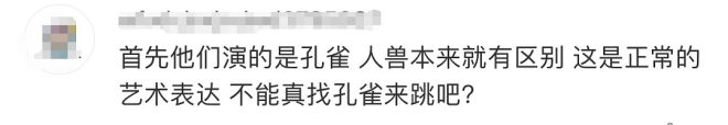 近日,有网友观众晒出杨丽萍团队,最新演出照片。 照片中男舞者穿着丁字裤,女舞者身着薄纱,舞蹈动作亲密表演尺度大,引发网络热议。 ![]() 9月6日,#杨丽萍新舞再被批尺度大#,冲上热搜。 ![]() 据了解,该舞蹈是杨丽萍执导的舞剧《春之祭》,杨丽萍在接受媒体采访时曾表示,舞蹈中加入了“万物生”“阴阳双修”的元素。 ![]() 杨丽萍的舞蹈引发争议并不是第一次,就在前不久,舞剧《孔雀》,就因男舞者造型尺度较大,全身只穿着一条肉色紧身打底裤。 舞台灯光下看起来像是全身赤裸,掀起网络热议。 对于这样的舞台表现,有网友提出质疑,认为没有美感,艺术的边界需要审慎。 ![]() ![]() 也有网友说,这种艺术表现很正常。 ![]() ![]() ![]() 还有网友觉得,艺术本身就众口难调。 ![]() ![]() |